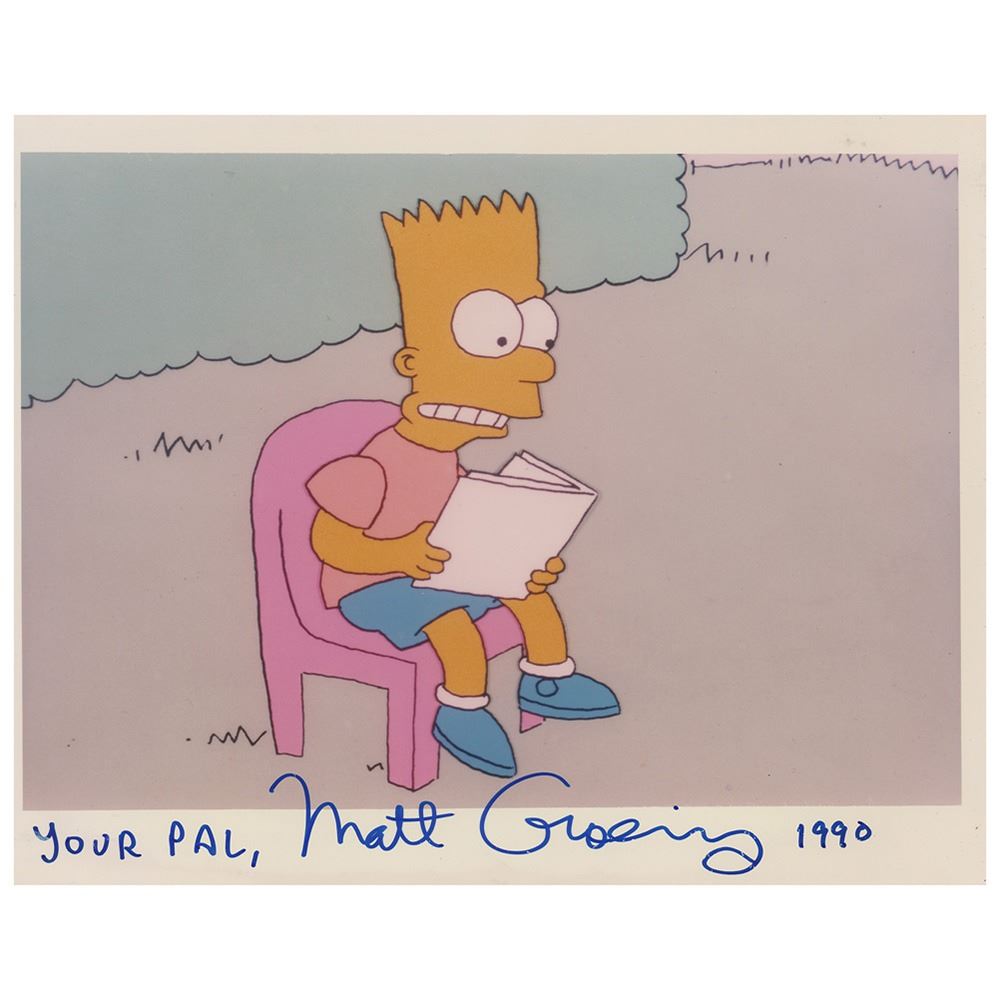 Early color glossy 10 x 8 photo of Bart Simpson reluctantly reading during an episode of The Simpsons, signed in blue felt tip, "Your pal, Matt Groening, 1990." In fine condition. The first season of The Simpsons aired on the Fox network between December 17, 1989, and May 13, 1990, with the second season premiering on October 11, 1990.