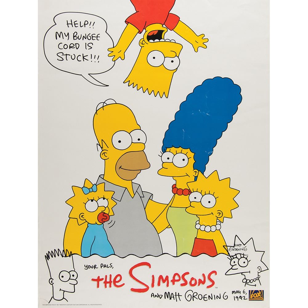 Color 18 x 24 Twentieth Century Fox poster for The Simpsons, signed in black felt tip, "Your pals, [The Simpsons] and Matt Groening, May 6, 1992," who adds sketches of Bart and Lisa to the lower corners and a speech bubble to the upside-down Bart image: "Help!! My bungie cord is stuck!!!" Rolled and in very good to fine condition, with light yellow haloing to the handwriting, and overall creasing, heaviest to Marge's hair.