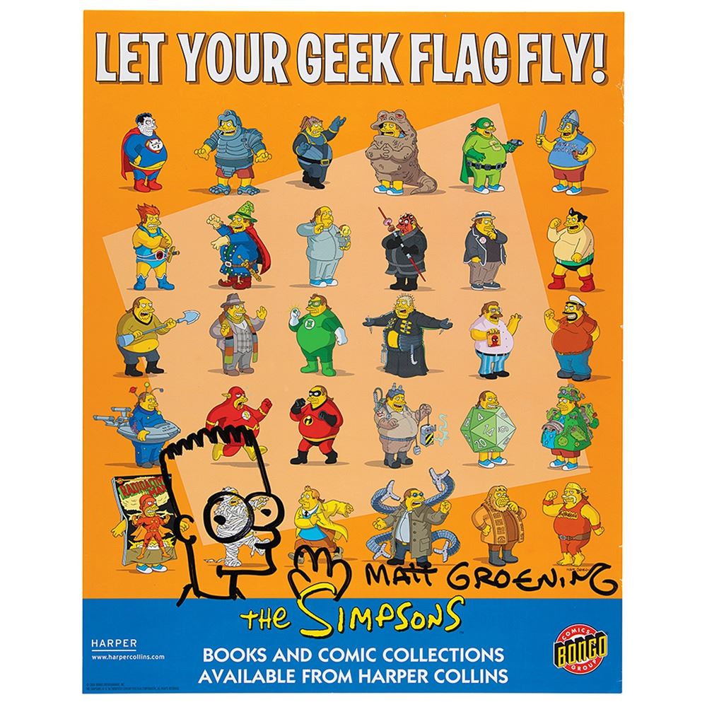 Color 16 x 20 Harper Collins / Bongo Comic Group poster for the Simpsons, featuring the show’s sarcastic Comic Book Guy as 30 different pop culture characters, signed in black felt tip by Matt Groening, who adds a large sketch of Bart. Rolled and in fine condition, with light creasing to extreme right edge.