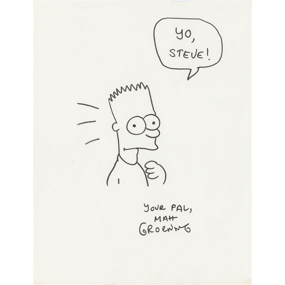 Original felt tip sketch of Bart Simpson accomplished by Groening on an off-white 9 x 12 sheet, inscribed within a speech bubble, "Yo, Steve!," and signed at the bottom, "Your Pal, Matt Groening." In fine condition.