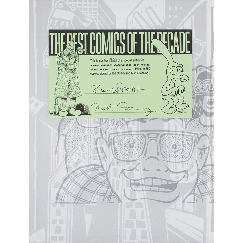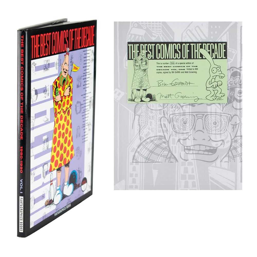 Signed book: The Best Comics of the Decade 1980-1990 Vol. I. Limited first edition, numbered 326/650. Seattle, WA: Fantagraphics Books, 1990. Hardcover with dust jacket, 9 x 11.25, 121 pages. Signed on the colophon affixed to the inside front cover by Matt Groening and Bill Griffith. In fine condition. A desirable book signed by two legends of comic art.