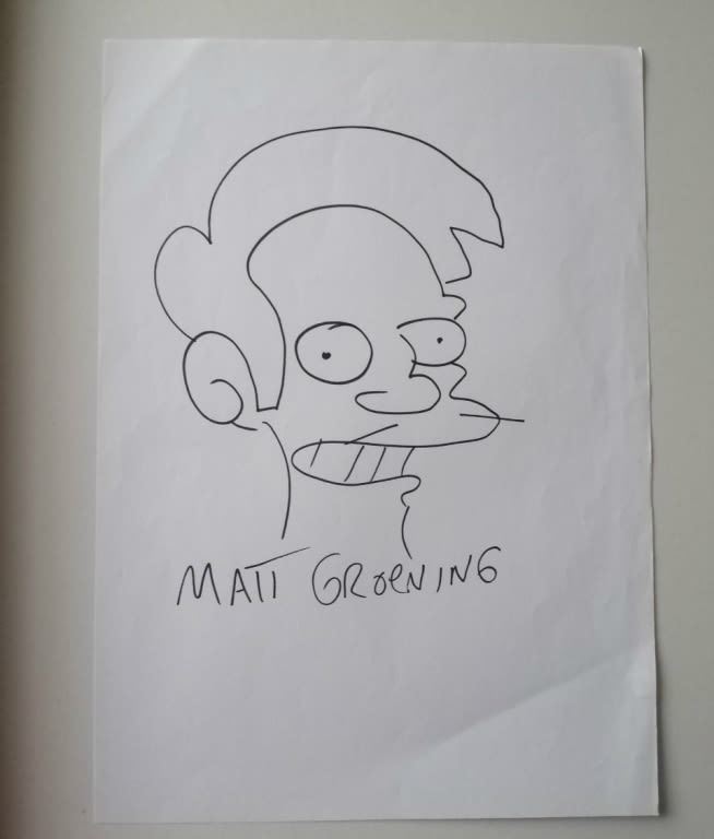 Drawing by and signed by Matt Groening on A4 paper. Supplied with coa.