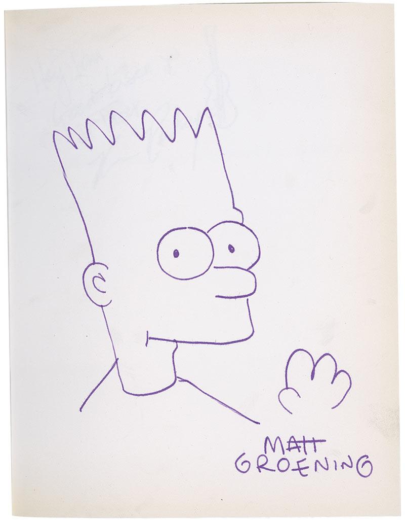 Original signed felt tip sketch of Bart Simpson on a white 7 x 8.75 page in an Andy Warhol Blank Book. The book also carries two other signatures. In fine condition, with faint edge toning and a small stain near the bottom left of Groening’s page.