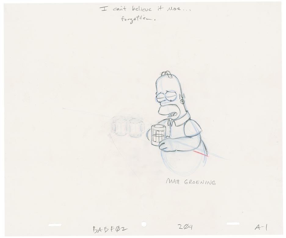 Original pencil production sketch of Homer Simpson talking into his beer on an 12.5 x 10.5 off-white sheet, signed in pencil by Groening. In fine condition, with a central vertical fold and usual animator’s markings, holes, and notations.