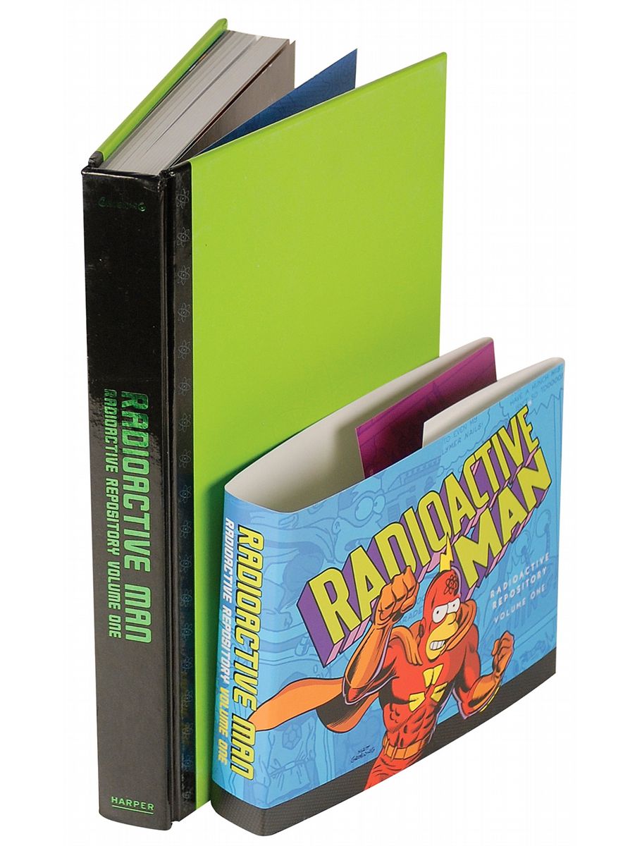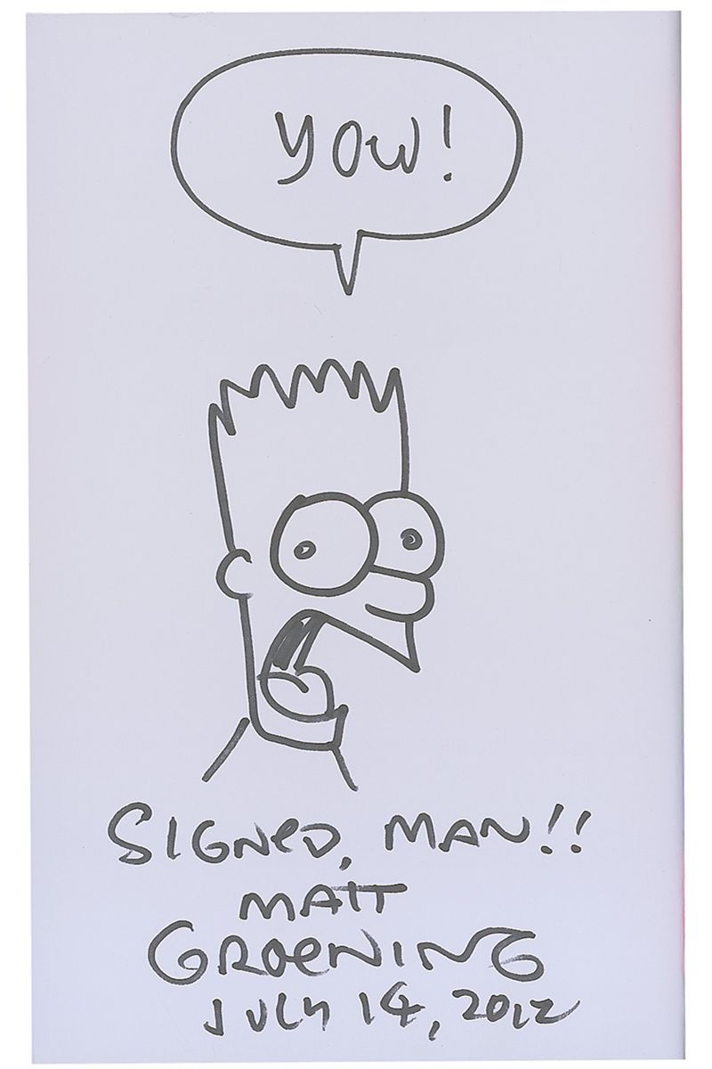 Signed book: Radioactive Man: Radioactive Repository Volume One. First edition. NY: HarperCollins, 2012. Hardcover with dustjacket, 7 x 10.5, 272 pages. Groening has drawn a large black felt tip Simpsons sketch on the reverse of the front free end page and signed below, “Signed, man!! Matt Groening, July 14, 2012.” In fine condition.