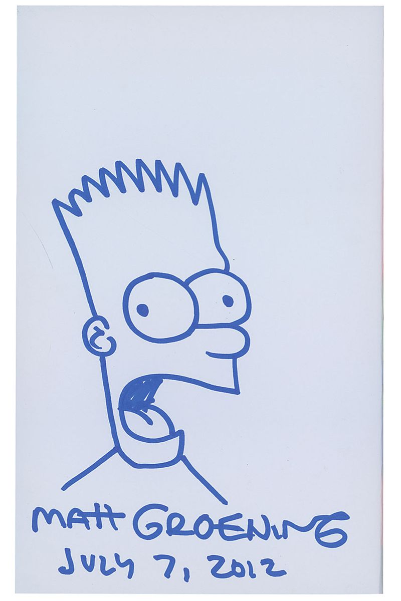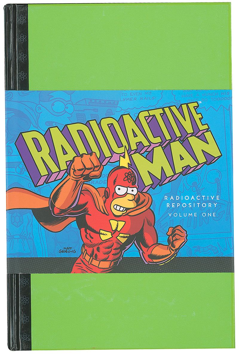 Signed book: Radioactive Man: Radioactive Repository Volume One. First edition. NY: HarperCollins, 2012. Hardcover with dustjacket, 7 x 10.5, 272 pages. Groening has drawn a large black felt tip Simpsons sketch on the reverse of the front free end page an