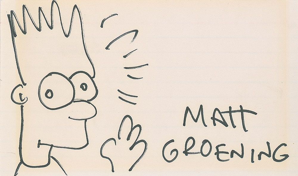 Original signed felt tip sketch of Bart Simpson on an off-white 5 x 3 card. In fine condition, with an overall shade of toning.