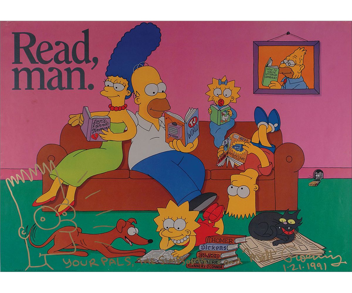 Color 31 x 22 poster of the Simpson family reading, signed in gold ink, “Your pals, the Simpsons and Matt Groening, 1-21-1991,” along with a large sketch of Bart to the lower left. Rolled and in fine condition, with a couple surface spots to the left side and light edge wear.