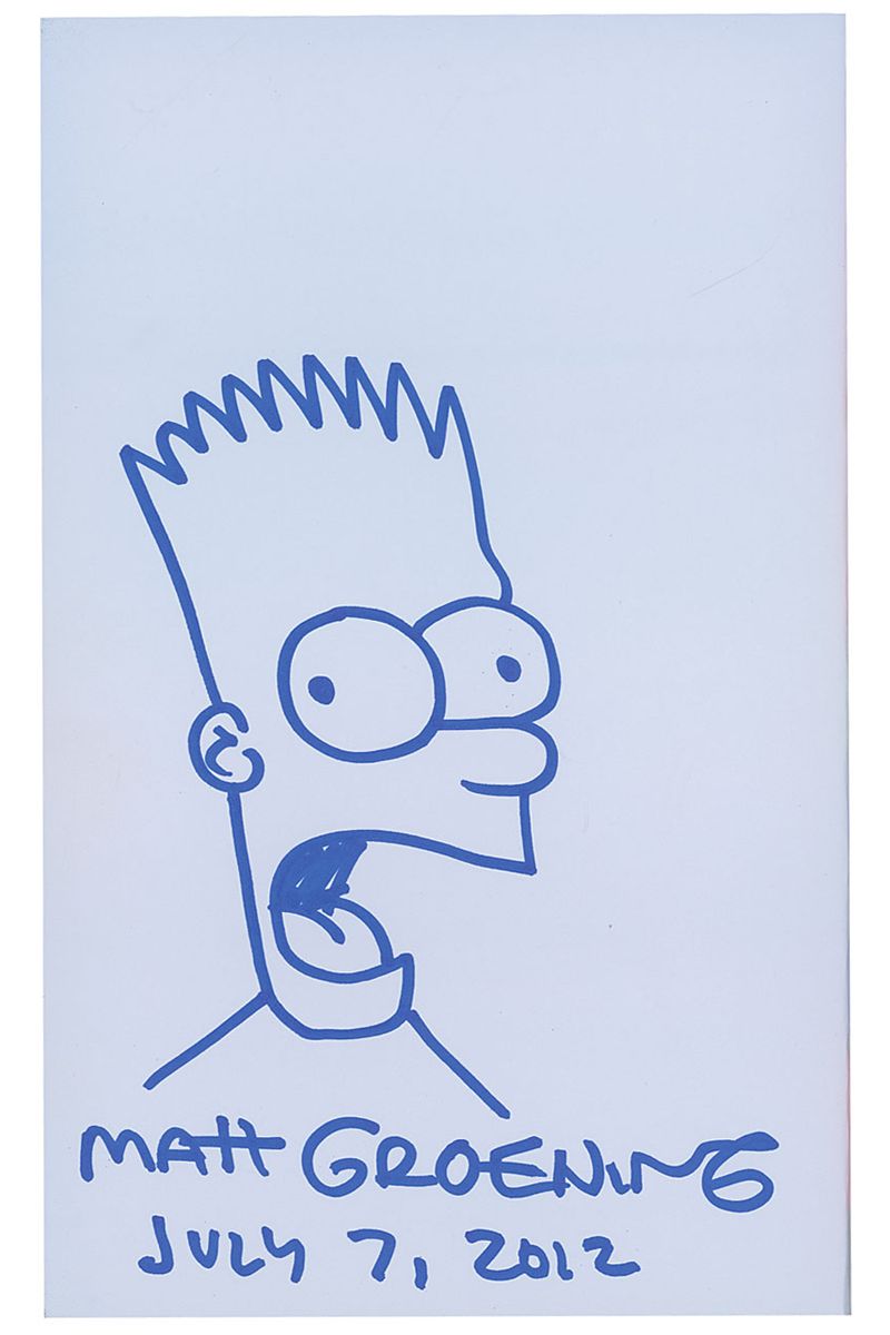 Signed book: Radioactive Man: Radioactive Repository Volume One. First edition. NY: HarperCollins, 2012. Hardcover with dust jacket, 7 x 10.5, 272 pages. Groening has drawn a large black felt tip Simpsons sketch on the reverse of the front free end page and signed below, “Matt Groening, July 7, 2012.” In fine condition.