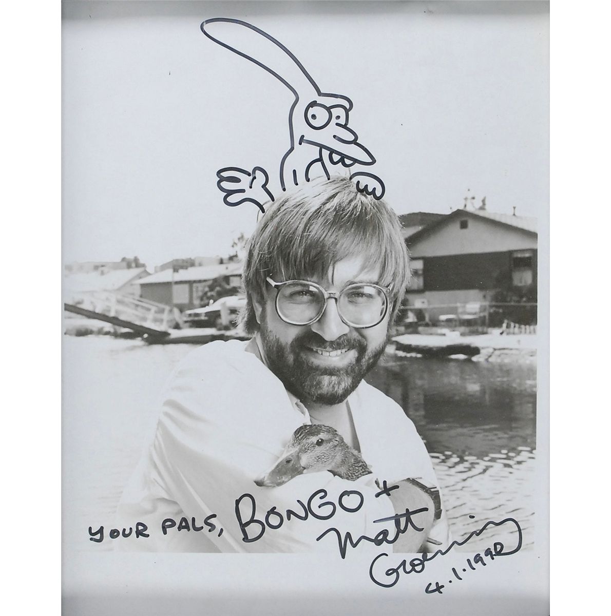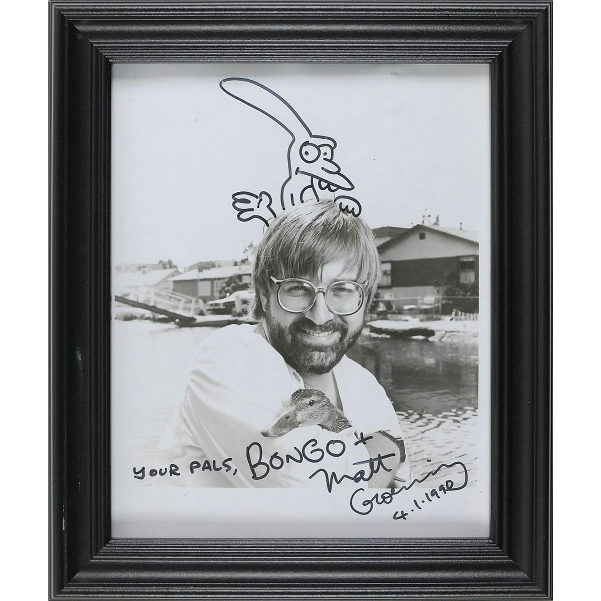 Glossy 8 x 10 photo of Groening posing along the waterfront with a duck in his arms, signed in black felt tip, “Your pals, Bongo & Matt Groening, 4-1-1990,” adding a sketch of Bongo above his head. Framed to an overall size of 10.5 x 12.5. In fine condition, with a few scattered light creases and dings.