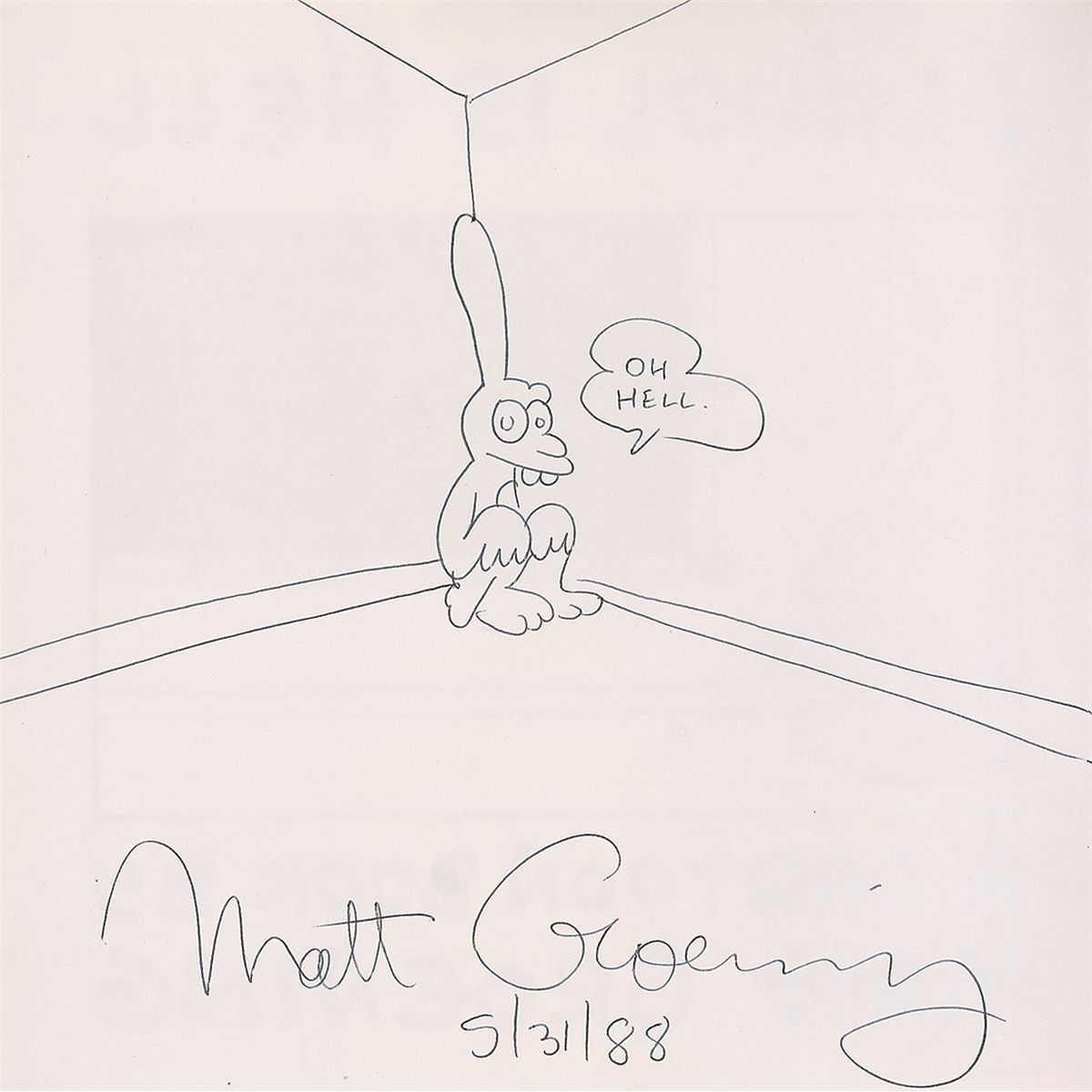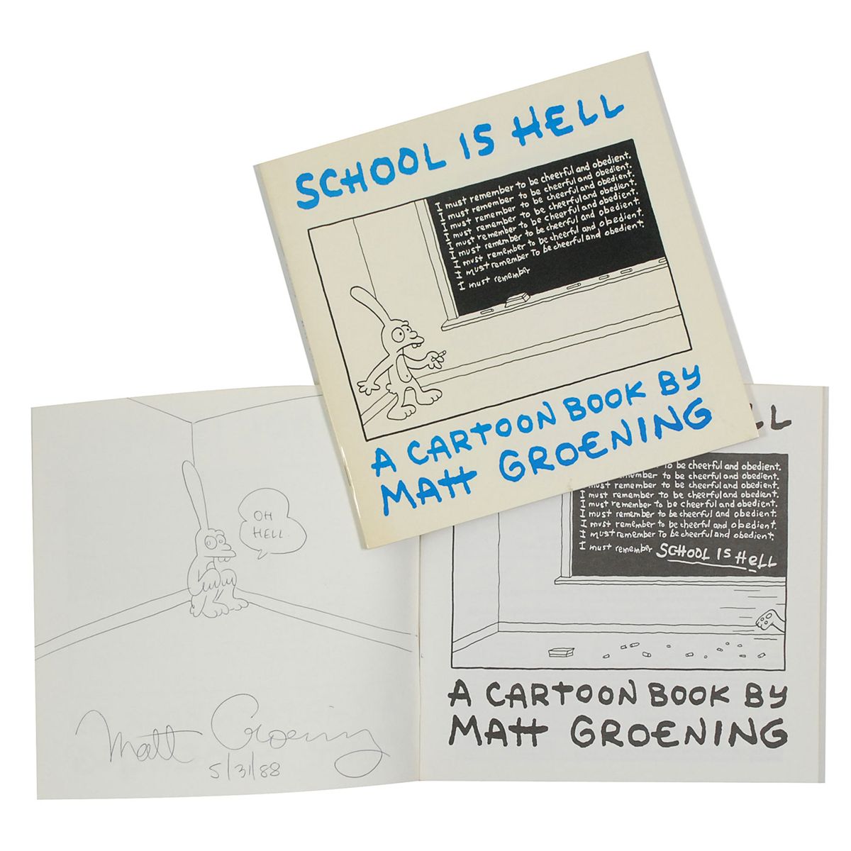 Two identical softcover School is Hell books from 1988, each signed on the inside front cover in black ballpoint by Groening, each dated May 31, 1988, and each bearing an original full page sketch of one of his rabbit’s sitting in a corner. In fine condition.
