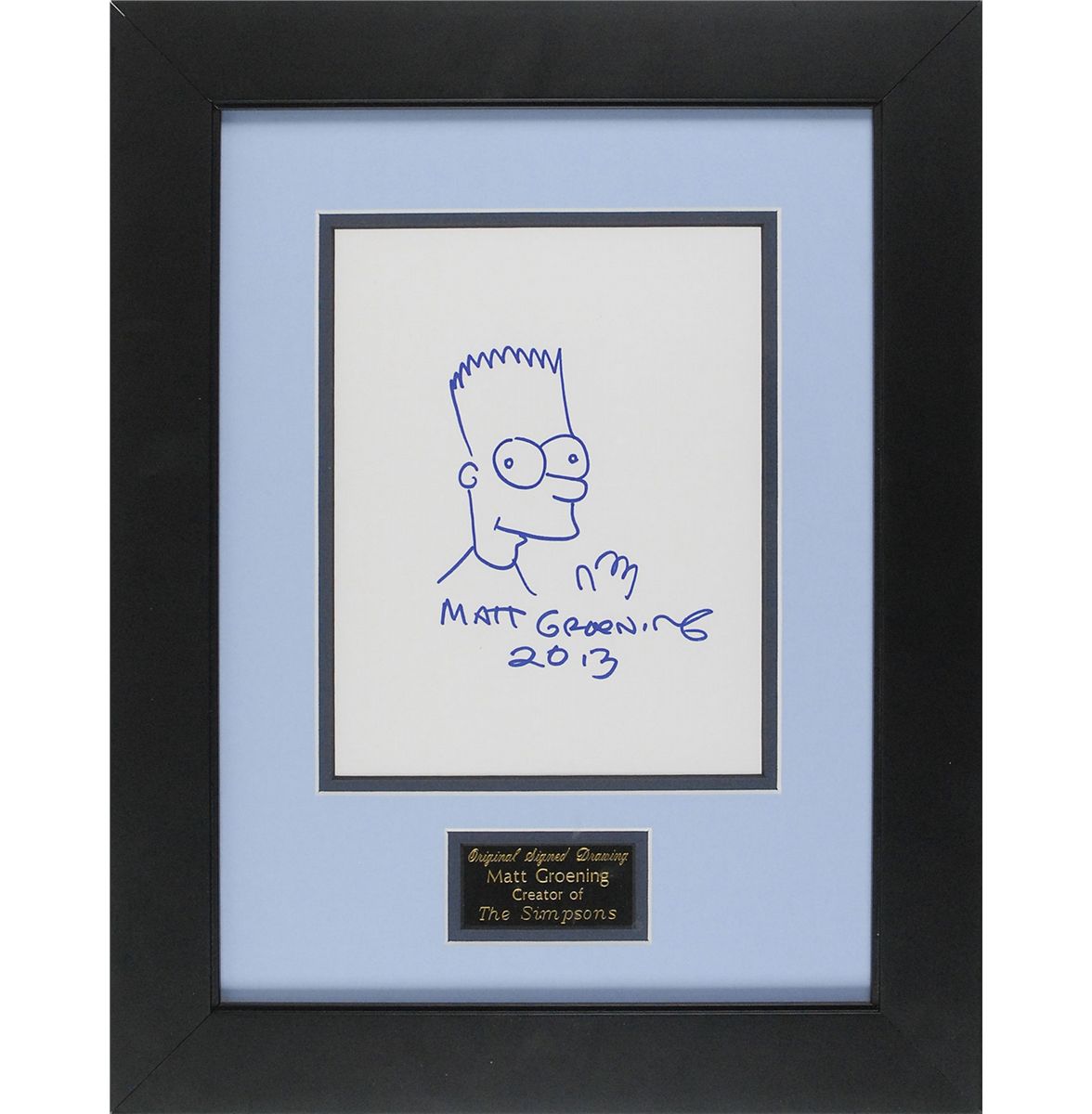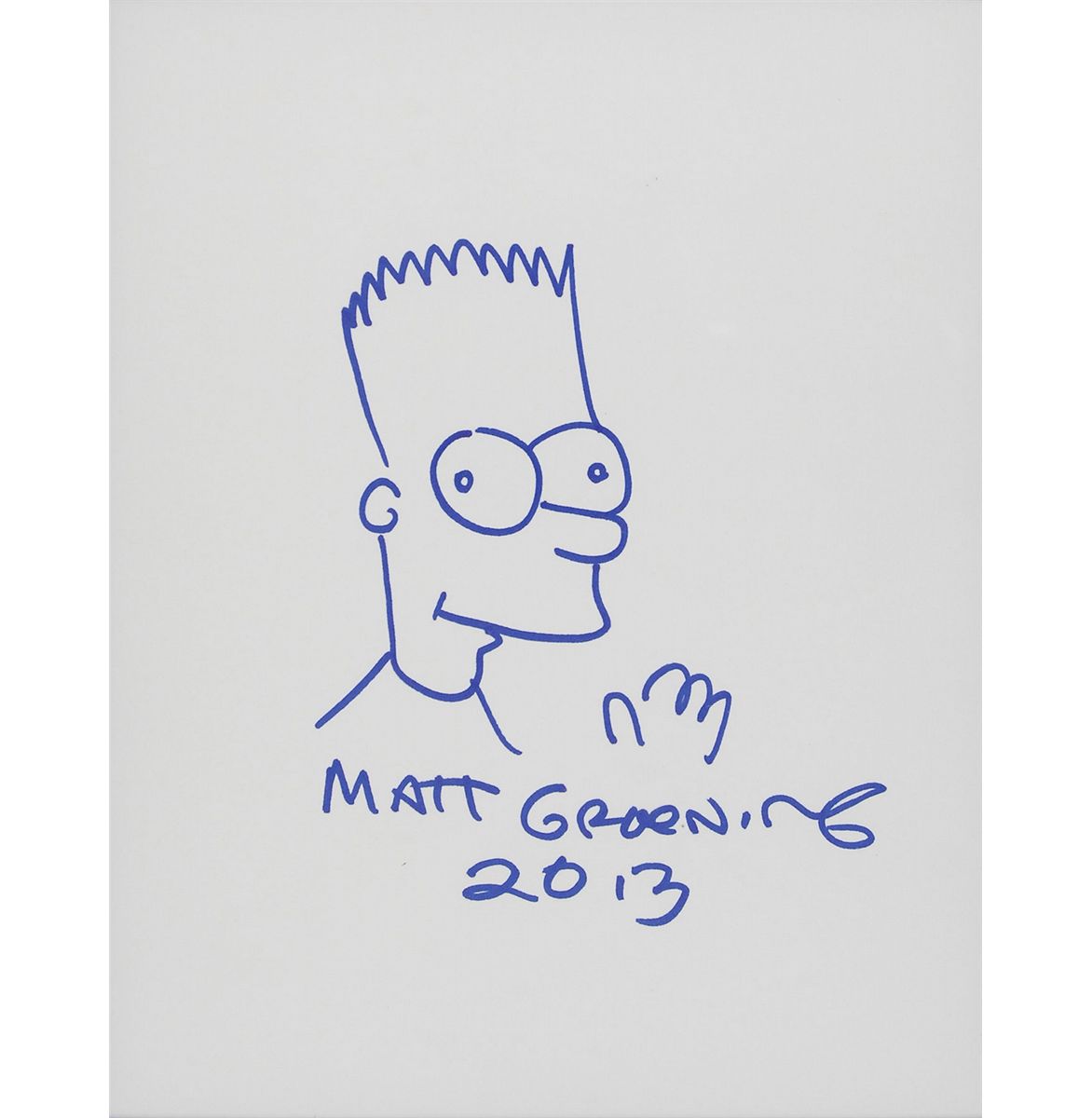 Original signed felt tip sketch of Bart Simpson on an off-white 6.75 x 9 card, signed under the image, “Matt Groening 2013.” Double-matted and framed with a small plaque to an overall size of 14 x 18. In very fine condition. Originally obtained by in-person specialist Mike Wehrmann.