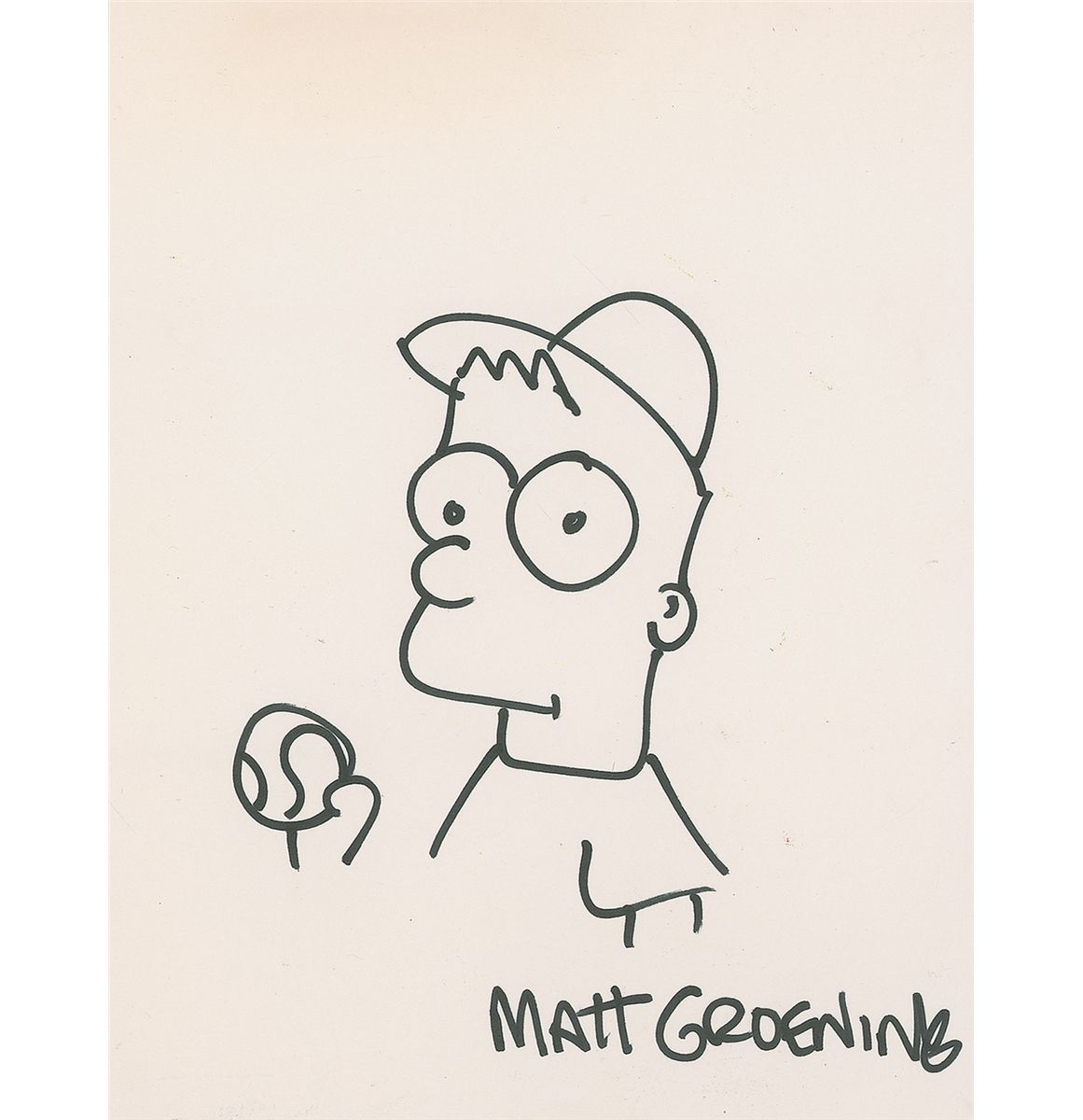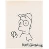 An American cartoonist, screenwriter, producer, animator, author, musician, comedian, and voice actor (born 1954), who is known most famously for creating the long-running animated show, The Simpsons. Original signed felt tip sketch of Bart Simpson wearing a cap and holding a baseball on an off-white 8.25 x 11 sheet, signed below the image. Collector’s notation on the reverse indicates that the sketch was drawn at Golden Apple Comics on Melrose Avenue in Los Angeles. In fine condition.