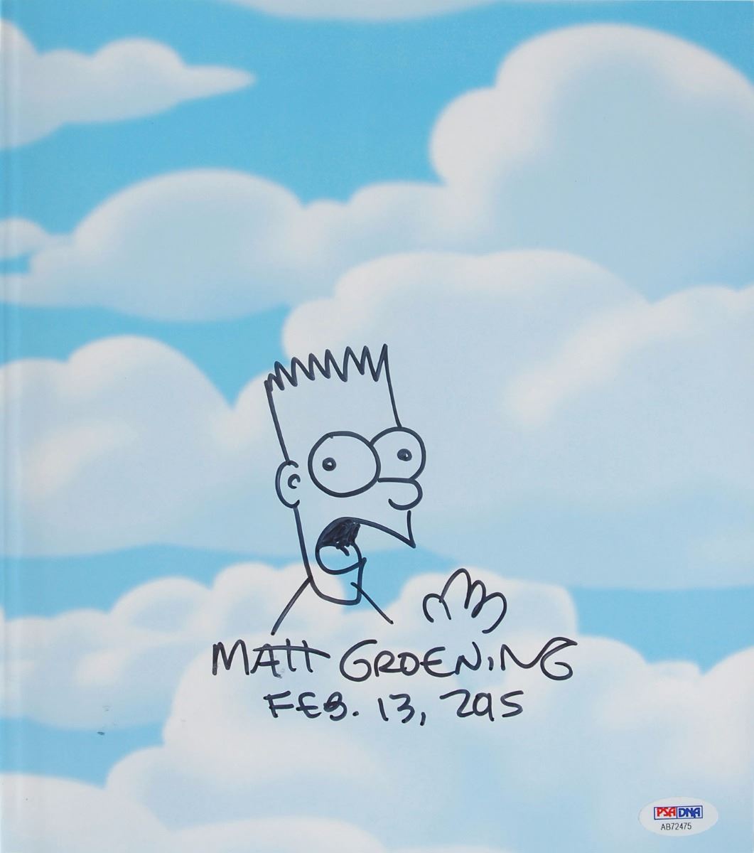 Signed book: The Simpsons: Family History. First edition. NY: Abrams, 2014. Hardcover with dust jacket, 9.75 x 11, 304 pages. Signed on the first free end page in black felt tip, “Matt Groening, Feb. 13, 2015,” adding a great sketch of Bart waving above the signature. In fine condition. Accompanied by a certificate of authenticity from PSA/DNA.