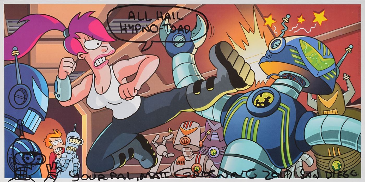 Fantastic color 24 x 12 poster for the show Futurama, showing a frightened Fry and Bender watching Leela jump-kicking a robot and shouting, "All Hail Hypno-Toad!," signed along the lower border in black felt tip, "Your pal, Matt Groening 2017 San Diego," who adds a small sketch of an angry Bender in the lower left corner. Rolled and in fine condition.