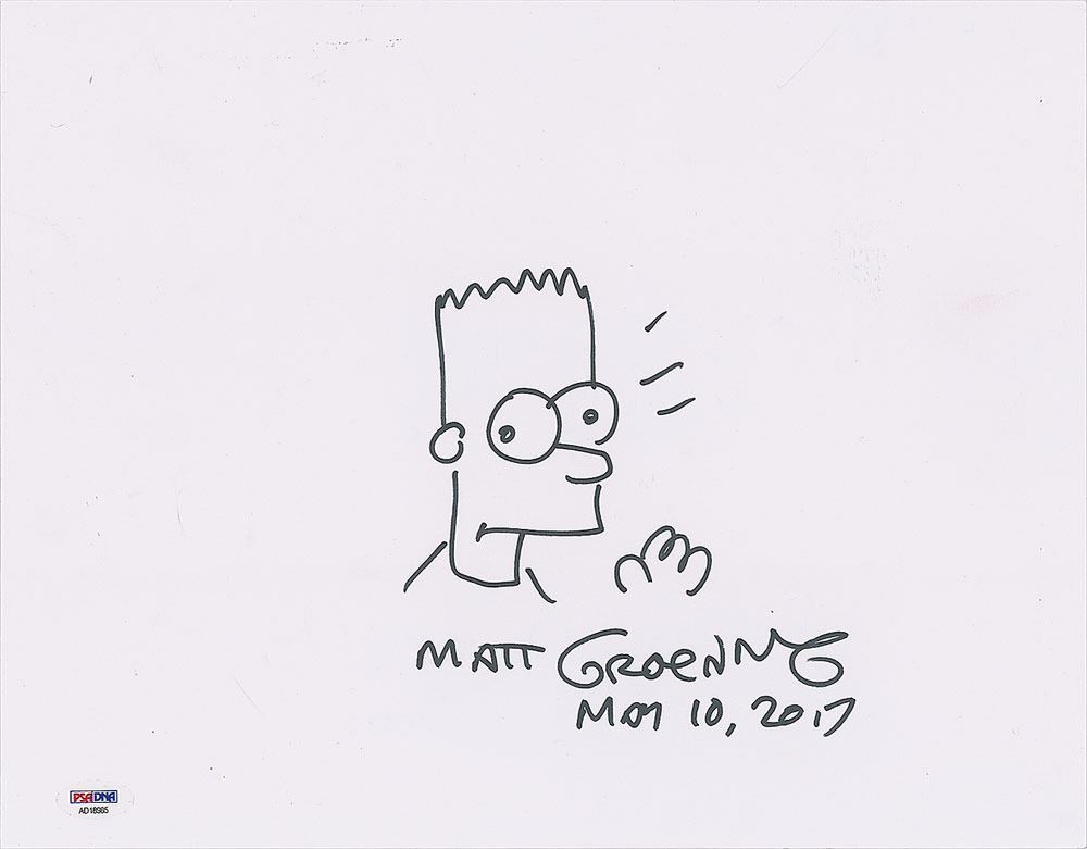 Sought-after original felt tip sketch of a waving Bart Simpson on a white 14 x 11 cardstock sheet, signed below in black felt tip, "Matt Groening, May 10, 2017." In very fine condition. Accompanied by a certificate of authenticity from PSA/DNA.