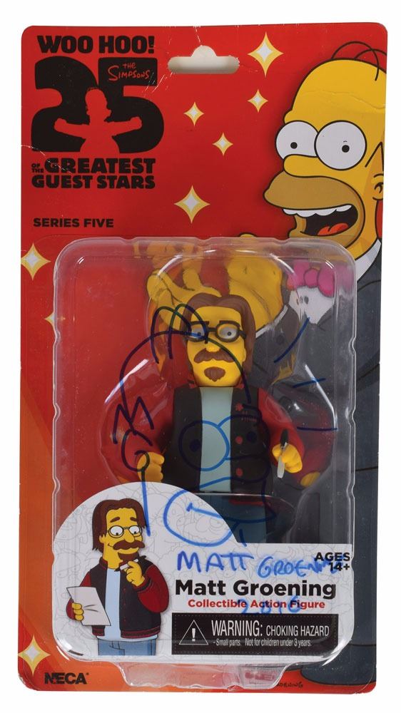 Never-opened NECA Matt Groening action figure from series five of The Simpsons '25 of the Greatest Guest Stars,' signed on the front plastic window in blue felt tip, "Matt Groening, 2016," adding a fantastic facial sketch of Homer Simpson. The action figure represents Groening's cameo appearance on the episode 'My Big Fat Geek Wedding,' which aired on April 18, 2004. In fine condition.
