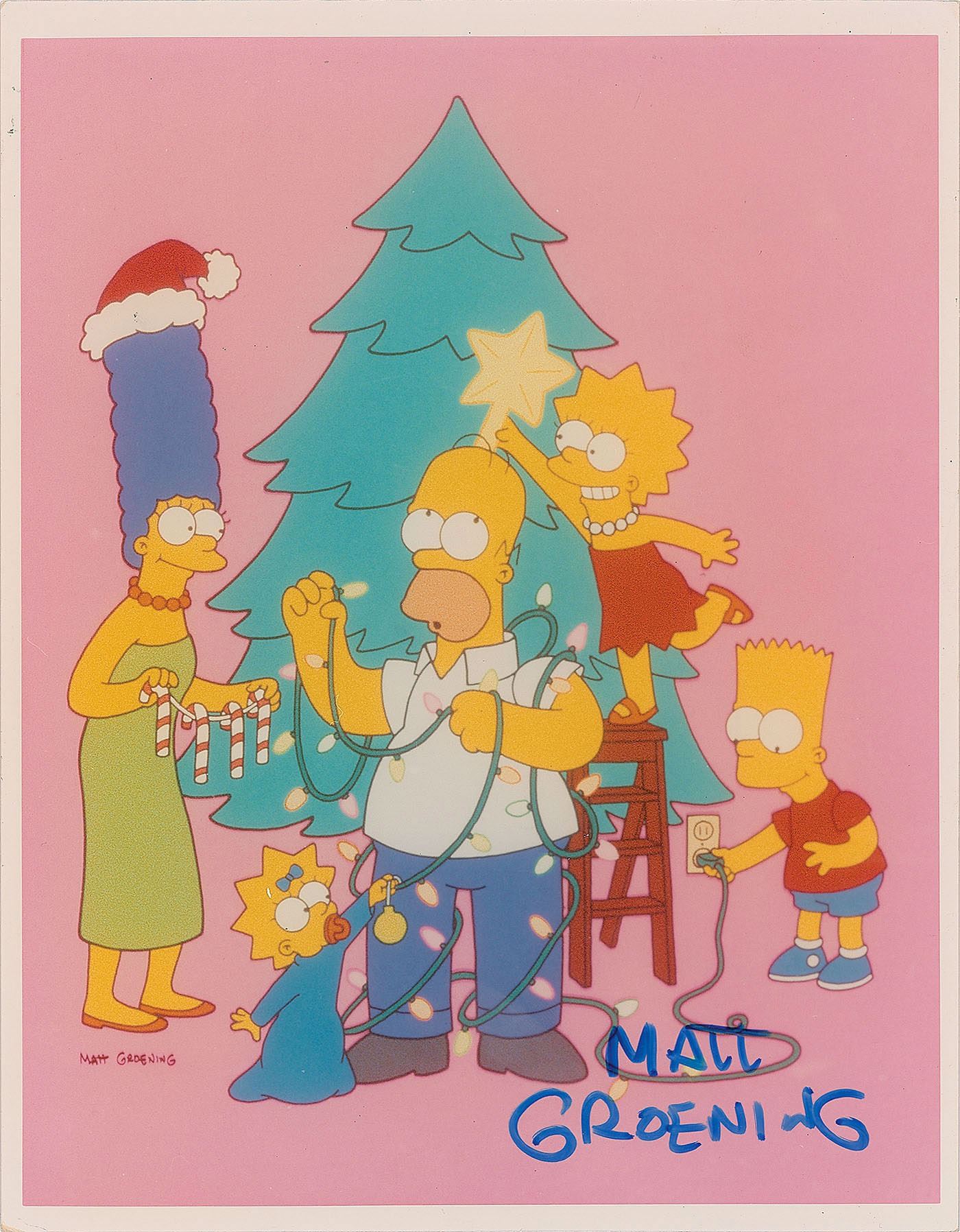 Color glossy 8 x 10.25 photo of The Simpsons decorating a Christmas tree, signed in blue felt tip by Groening. In fine condition.
