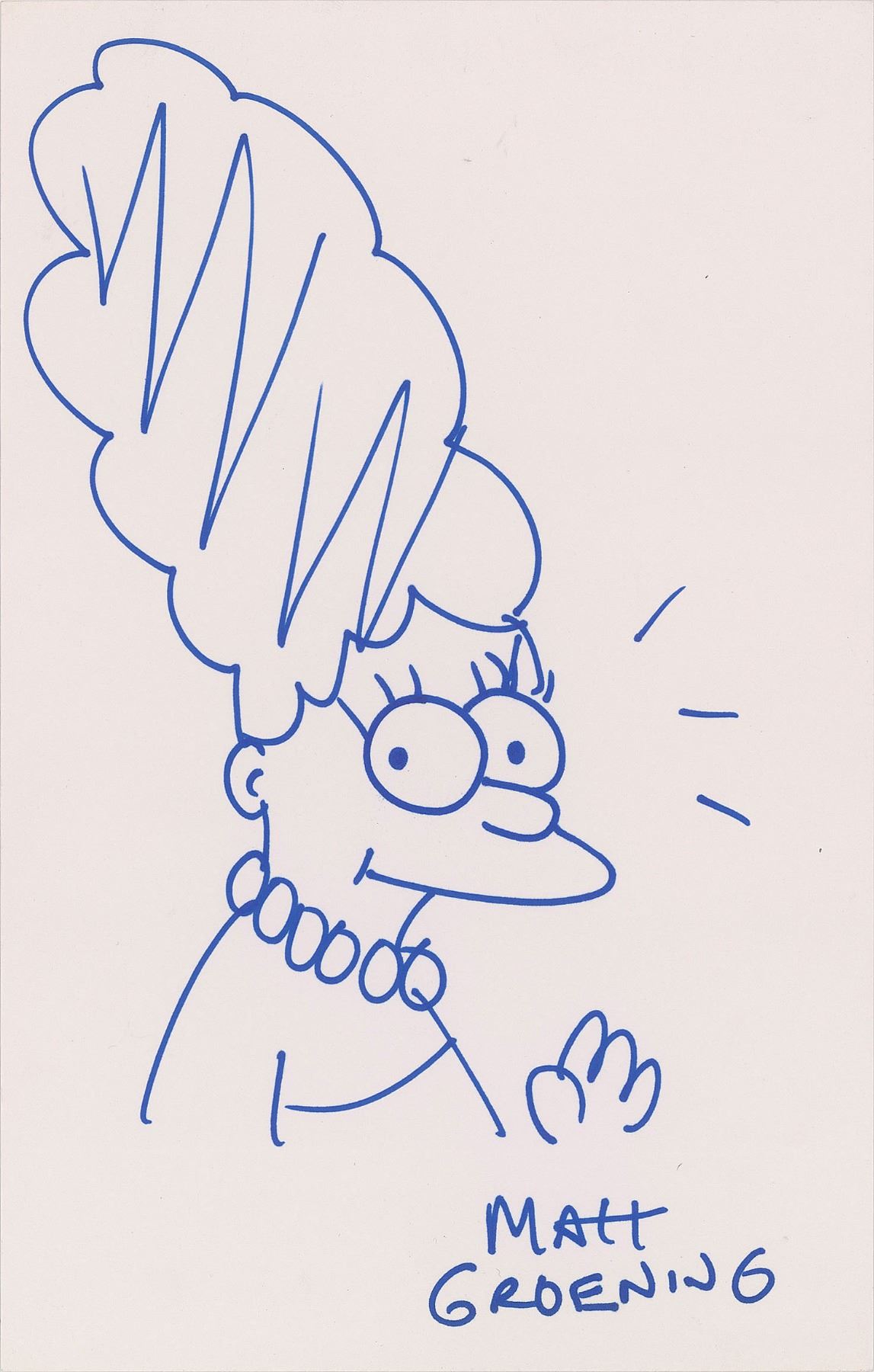 Original blue felt tip sketch of Marge Simpson waving on a white 7 x 11 sheet, signed below by Matt Groening. In very fine condition. Marge sketches are seldom encountered.