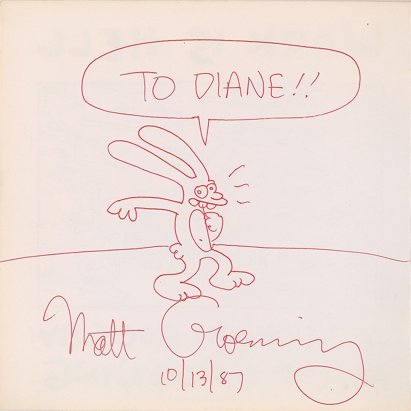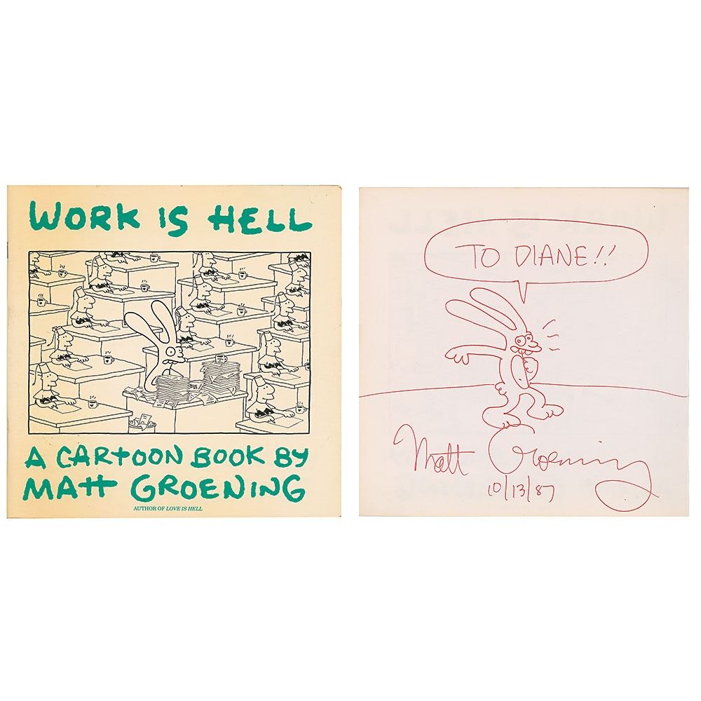 Signed book: Work Is Hell. First Pantheon edition. NY: Pantheon Books, 1986. Softcover, 9 x 9. Signed prominently on the inside of the front cover in bold red ink, "Matt Groening, 10/13/87," who draws a fantastic full-length sketch of Binky the rabbit, with inscription in speech bubble above, "To Diane!!" In fine condition, with trivial toning to covers. This wonderful sketch of Binky, the main character in Groening's celebrated Life in Hell comic strip, was drawn at a most significant time in the artist's career—at this juncture, the Simpson family were only in their second season on The Tracey Ullman Show, and still over two years away from making their Fox network debut on December 17, 1989. The earliest sketch from Groening that we have ever offered.