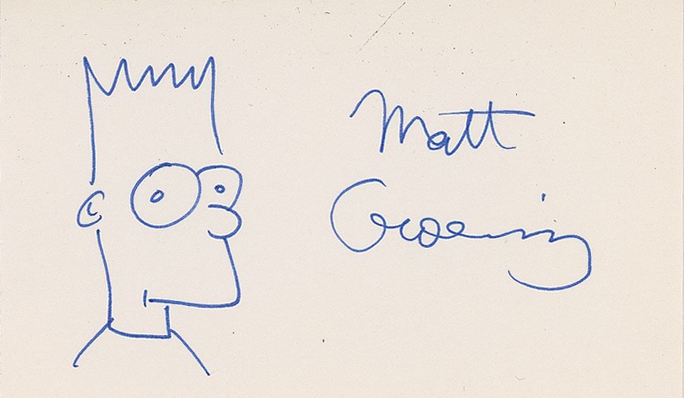 Classic original felt tip sketch of Homer Simpson accomplished by Groening on an off-white 5 x 3 card, neatly signed on the right side, "Matt Groening." In very fine condition. Originally obtained in person by a New York autograph collector who collected from the 1950s through the 2000s.