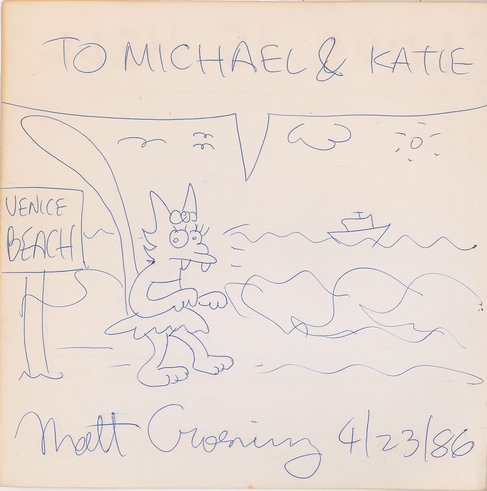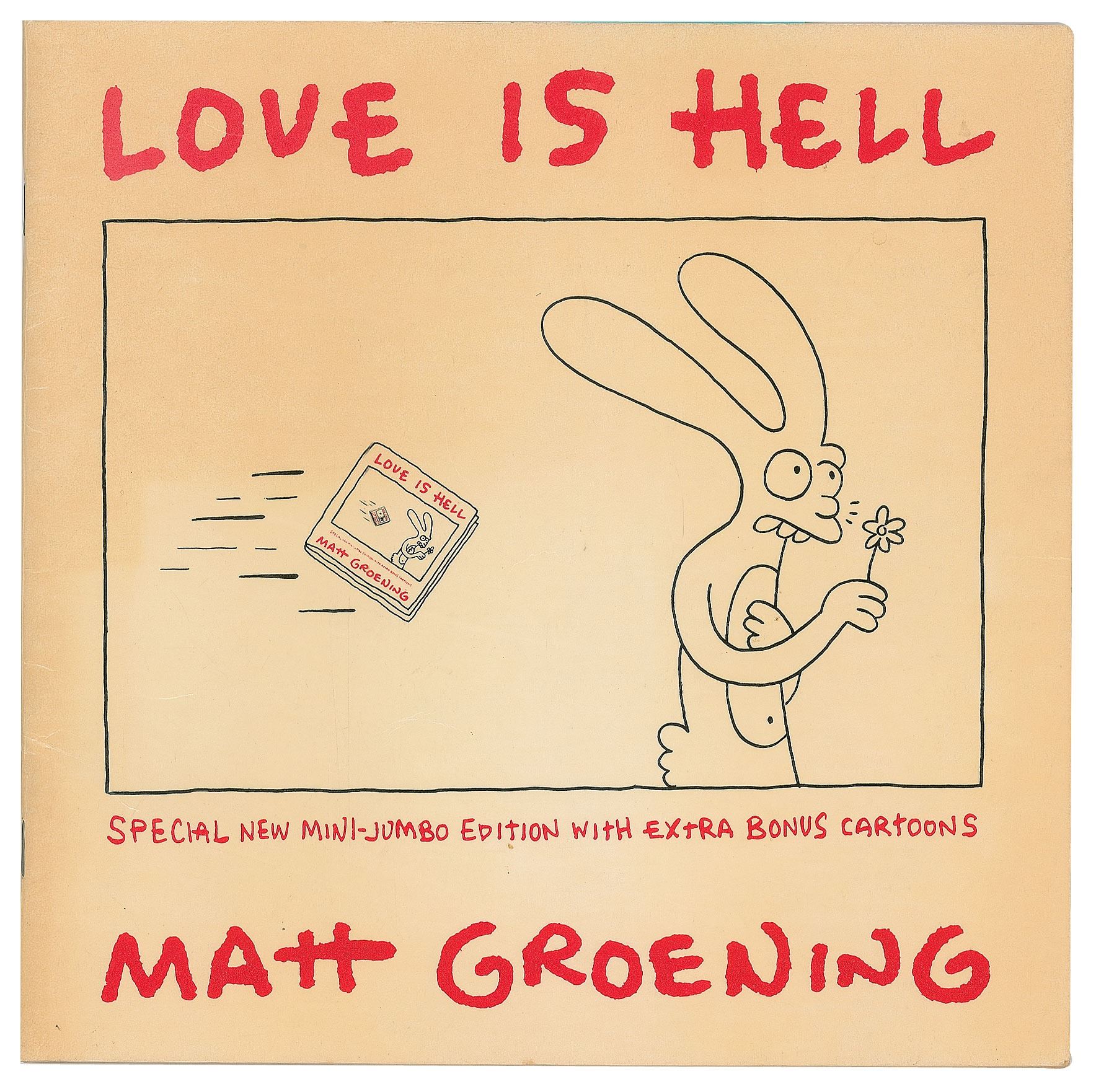 Signed book: Love Is Hell, ‘Special New Mini-Jumbo Edition.’ First Pantheon Edition. NY: Pantheon Books, 1985. Softcover, 9 x 9, 46 pages. Signed prominently on the inside front cover in black ballpoint, "Matt Groening, 4/23/86," who adds a rare full-length sketch of Snarla the cat standing on Venice Beach, with Groening adding a speech bubble inscription above, “To Michael & Katie.” In fine condition, with some light creasing to front cover.