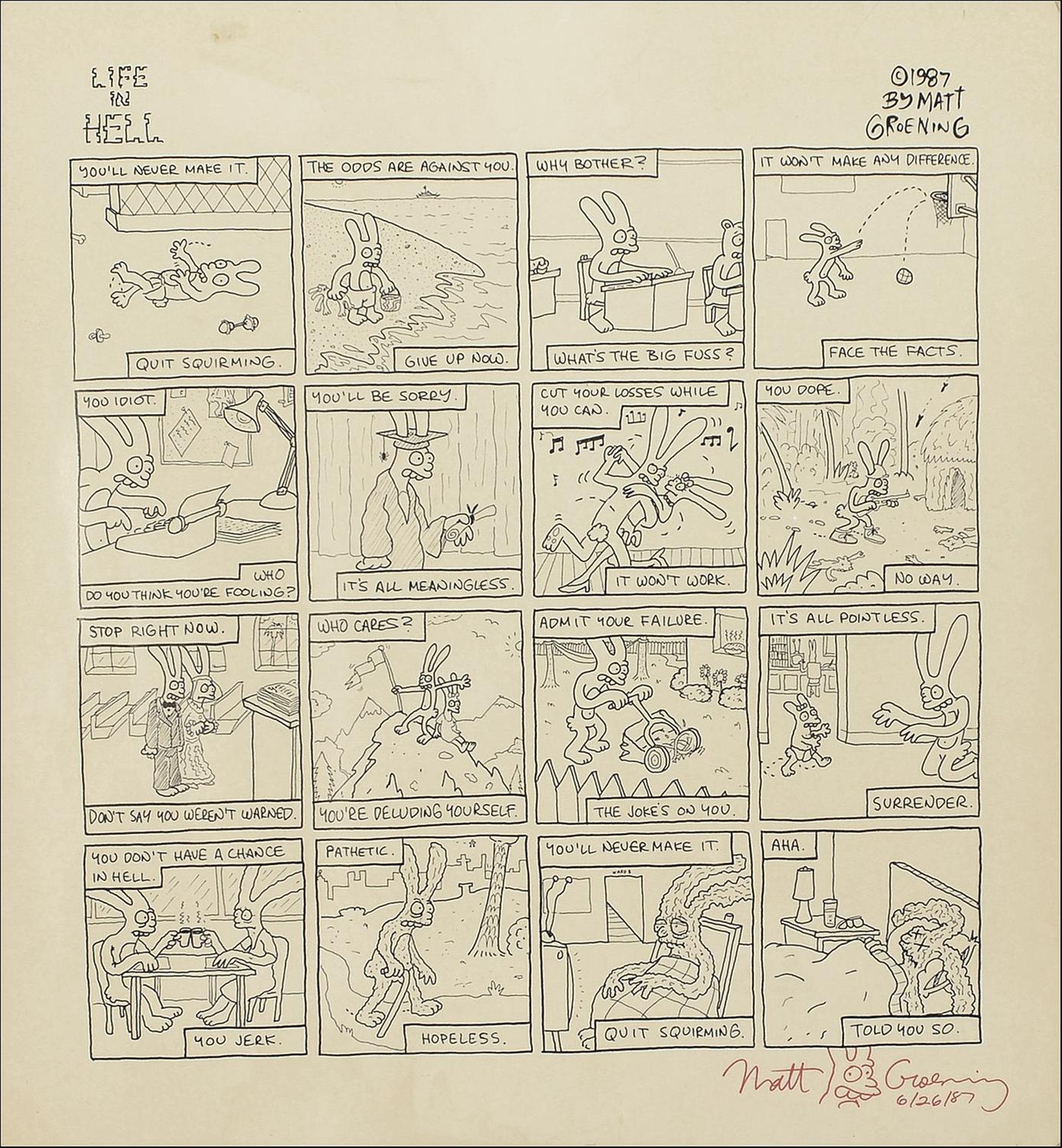 Depressing poster, 25 x 23, of a Life Is Hell comic strip, signed in the lower border in red felt tip, “Matt Groening 6/26/87,” adding a small bunny sketch between his signature. Rolled and in very good condition, with scattered creasing and toning.