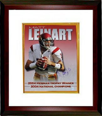Matt Leinart played college football at Southern California, leading them to an AP national championship in 2003, a BCS national championship in 2004, and an appearance in the BCS National Championship game in 2005. In 2004, his junior year at USC, he won the Heisman Trophy. He also won the inaugural Manning Award for college quarterbacks in the same season. Matt Leinart has hand autographed this USC Trojans 16x20 Portrait Photo. Leinart Hologram and Certificate of Authenticity from Athlon Sports. Custom White Mat and Premium Mahogany Color Framed as shown