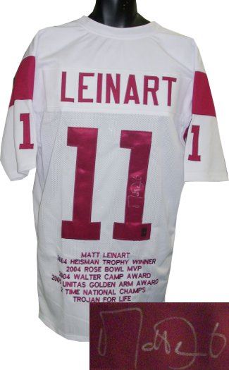 Matt Leinart played college football at Southern California, leading them to an AP national championship in 2003, a BCS national championship in 2004, and an appearance in the BCS National Championship game in 2005. In 2004, his junior year at USC, he won the Heisman Trophy. He also won the inaugural Manning Award for college quarterbacks in the same season. Matt Leinart has hand autographed this USC Trojans Jersey with Embroidered Stats. Leinart Hologram and Certificate of Authenticity from Athlon Sports.