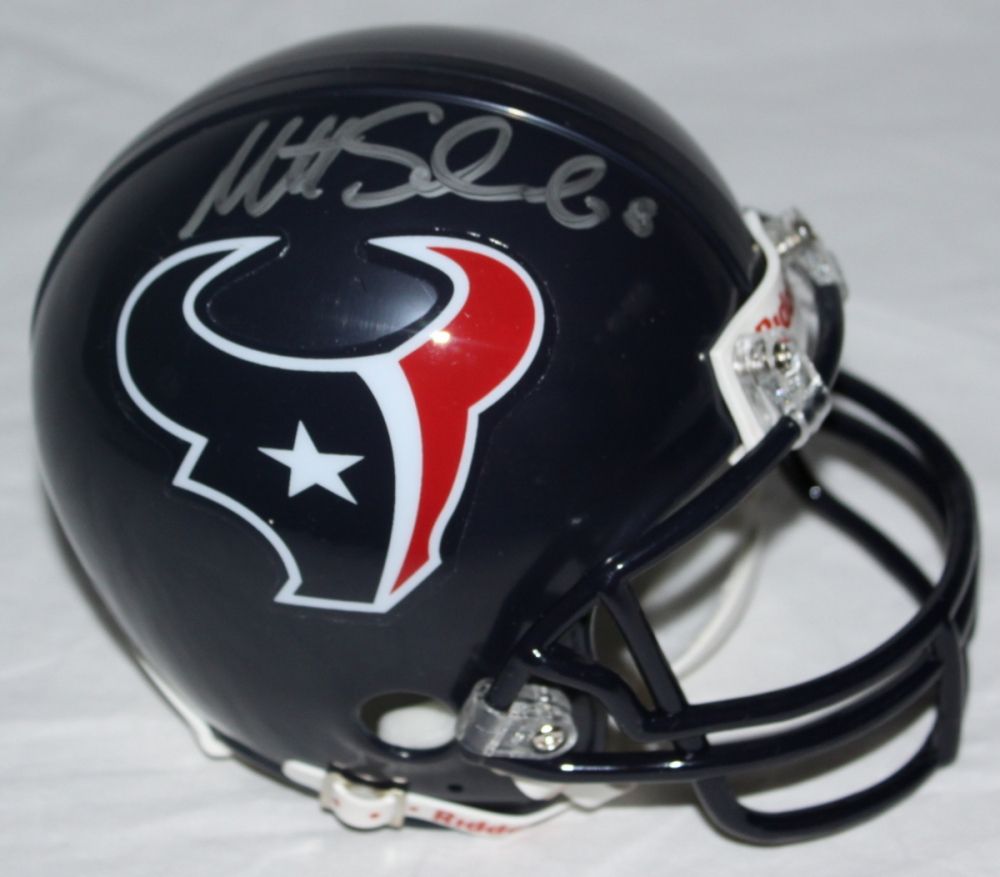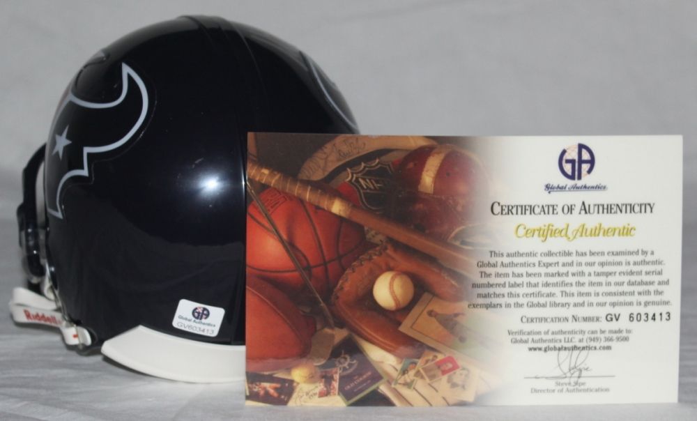 Riddell Texans mini-helmet hand-signed in silver paint pen. The autograph has been reviewed and authenticated by Global Authentics (GA) and includes their official serially numbered hologram and matching COA.