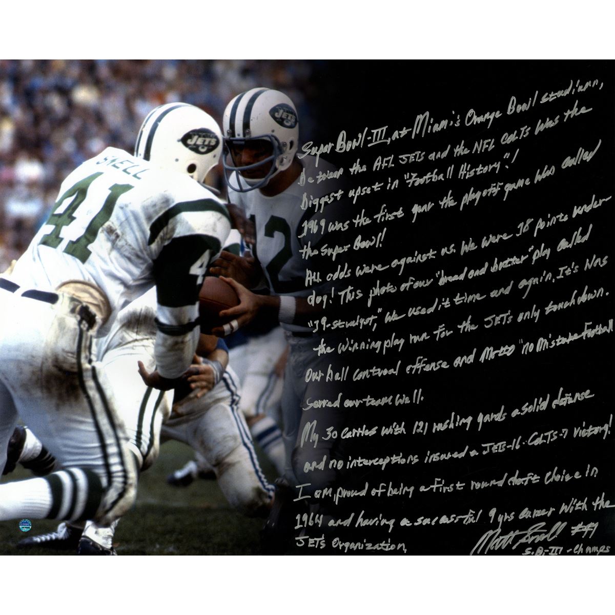 Matt Snell Signed 69' Jets 16x20 "Story" Photo