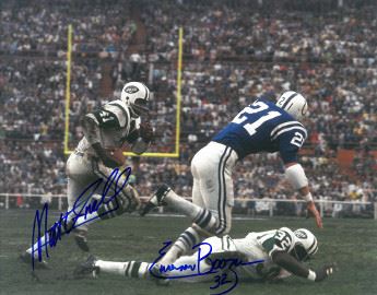 Emerson Boozer played his entire professional career with the Jets. Boozer was a member of the Jets team that defeated the NFL's champion Baltimore Colts, 16-7, in Super Bowl III. Jets coach Wilbur 'Weeb' Ewbank utilized Boozer in pass blocking schemes then new to football. In blocking for both Matt Snell and Joe Namath, Boozer was part of two outstanding teams that narrowly lost just three games in 1968 and went 10-4 in 1969. In his rookie year with the New York Jets, Snell rushed for a team-record 180 yards against the Houston Oilers on his way to a 945-yard season and AFL Rookie of the Year honors. Snell went on to become an AFL Eastern Division All-Star in 1964 and 1966, and the Sporting News All-AFL fullback in 1969. Emerson Boozer & Matt Snell have both hand autographed this 8x10 Photo. Certificate of Authenticity from Athlon Sports.