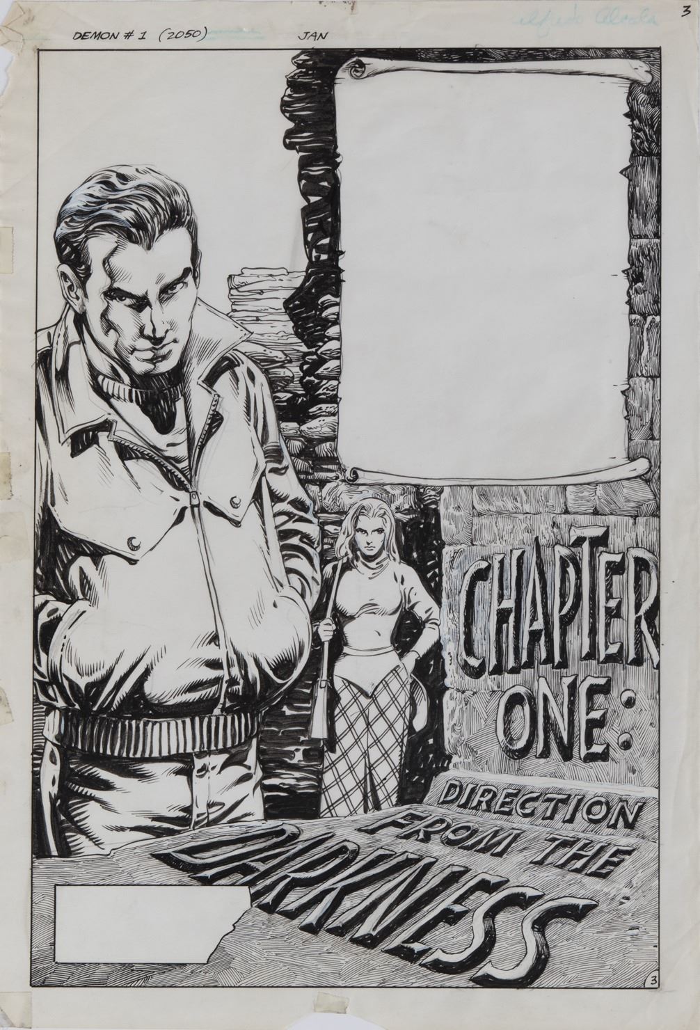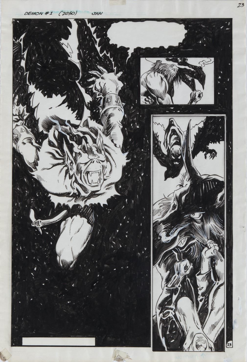 199. Matt Wagner and Alfredo Alcala original artwork for a 21-page story from the unrealized comic Demon #1. (DC, ca. 1990s) Consisting of (21) original art pages accomplished in pencil and ink on 11.5 x 16.5 in. artist's vellum, and (2) additional photostatic pages. An unpublished story though completely penciled and inked. Notated in pencil, "Alfredo Alcala" on page three, likely indicating he inked the piece. This is a fascinating and desirable set of pages to an unpublished story, possibly for an proposed Demon 2050 comic. Lovely and detailed inking by Alcala is reminiscent of other DC/Vertigo work such as Swamp Thing. A rare chance to purchase an unpublished yet seemingly complete story. In very good condition. $400 - $600