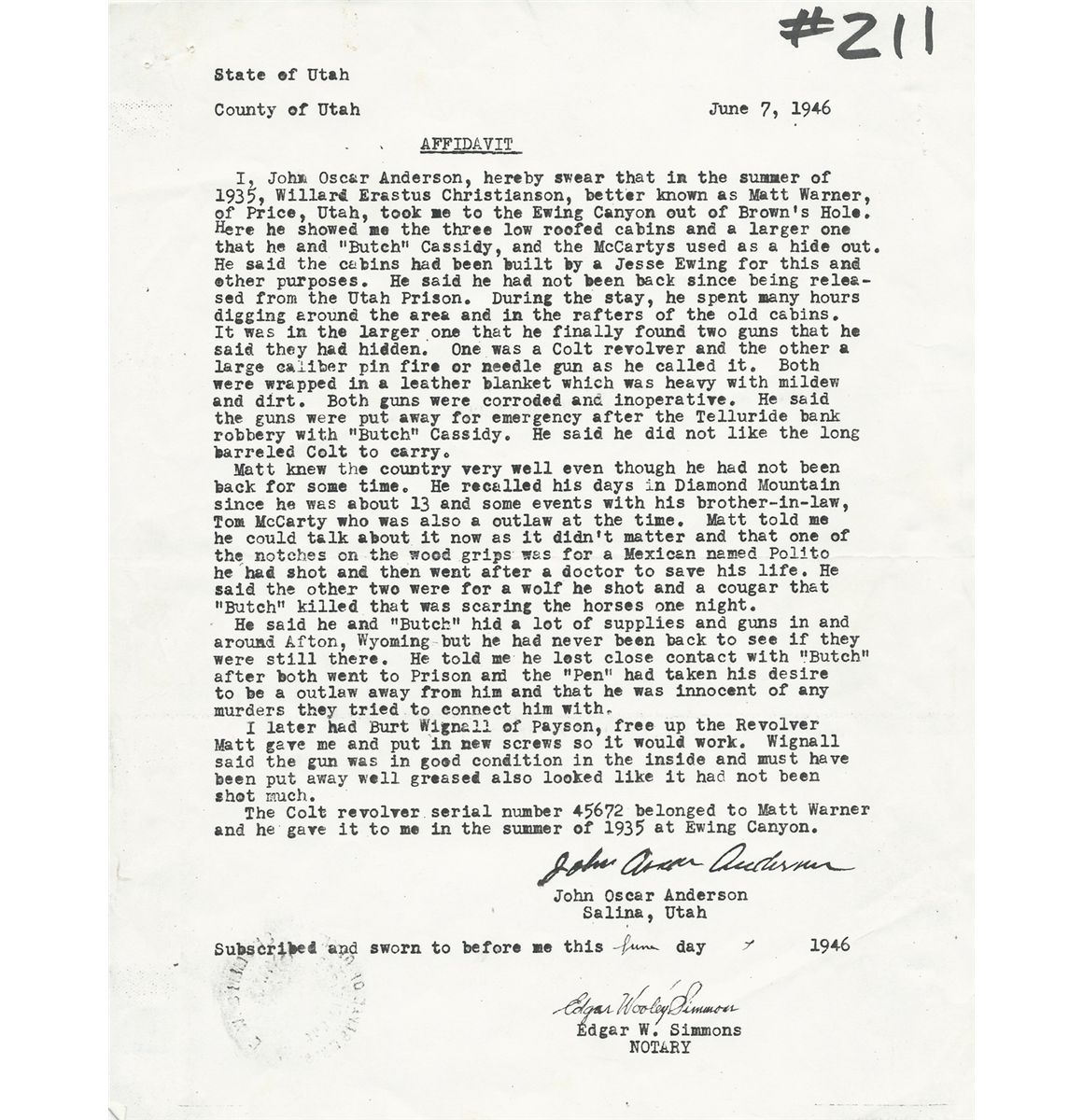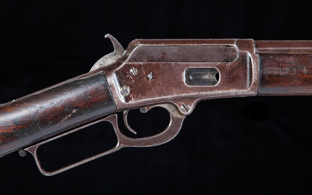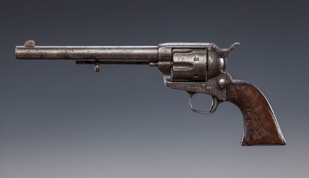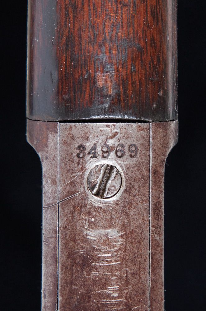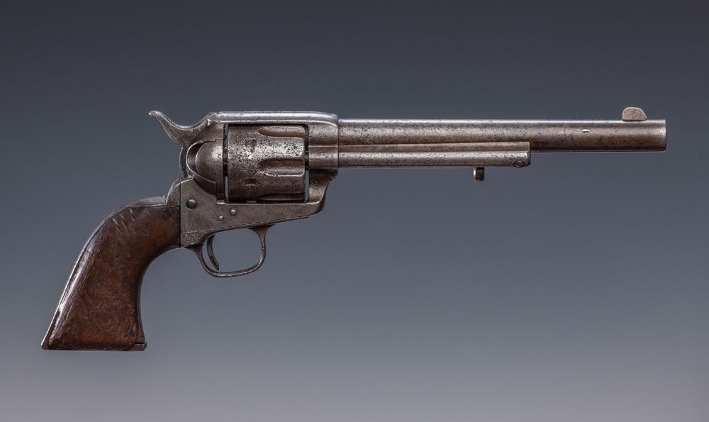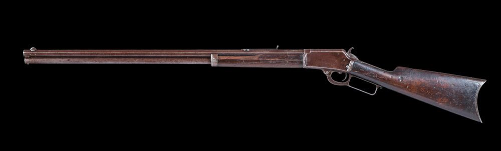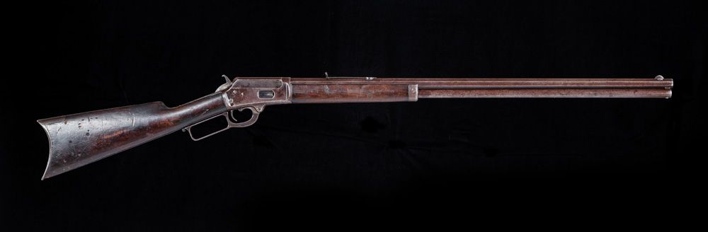 Matt Warner's Marlin Rifle and Colt Revolver. Two frontier weapons with provenance to the famous "Wild Bunch" member and good friend of Butch Cassidy, Matt Warner. a) S/N 45672, circa 1878, .45 LC, 7 1/2" barrel, Colt Single Action Army with “Bridgeport” stud, civilian purchase, correct barrel address, type II hammer knurling. Besides the usual civilian usage, several hundred were purchased by the Army but found unfit for field duty. CONDITION: finish over all is gray with pitting scattered over the surface, hammer knurling, patent marks and barrel address are faint, all numbers match including barrel and cylinder, action needs timing, walnut grips have shrunk. b) S/N 34969, circa 1890, .44 caliber, 28" octagon barrel, Marlin 1889 Rifle, standard Marlin rifle wood, correct Rocky Mountain Buckhorn rear sight, no elevator, special order Lyman hunting front sight. Factory letter noting shipped August 18, 1890. CONDITION: 95% blue overall that has mostly turned plum brown, bore is dark with scattered oxidation the entire length, forearm is cracked with piece missing on left side, butt is very good with plenty of use dings, mechanically very good. With original, notarized affidavit from John Oscar Anderson attesting to the authenticity and history of the guns, as they were given to him in 1935 by his friend, Matt Warner. He states in the detailed affidavit that "[Warner] said the guns were put away for emergency after the Telluride bank robbery with "Butch" Cassidy. He said he did not like the long barreled Colt to carry.". MATT WARNER BIO. Matt Warner (1864 - 1938). Western outlaw turned lawman, born Willard Eratus Christiansen to Mormon parents, he used the alias Matt Warner after he thought he had killed a cowboy in a dispute. During the early 1880's, he built his ranch at Diamond Mountain and supplemented his income by various criminal activities. During one of his criminal exploits, an unexpected chase by a local posse ran him all the way back to Robber's Roost in southeastern Utah. During this time in the outlaw hideouts of Utah, he met Butch Cassidy and Tom McCarty, (who married Warner’s sister). Between 1885 and 1889, with the Wild Bunch, he robbed the Denver & Rio Grande train lines and a Telluride, Colorado bank. After several more robberies from New Mexico to Washington State with Tom McCarty, he settled down on a ranch in Utah. About 1896, while on a prospecting trip, he was ambushed in a gunfight, killed two, wounded a third, was arrested and convicted. After serving four years of a five-year sentence for this shootout, he was pardoned and released by Utah Governor Heber M. Wells in 1900. In the early 1900's he became a justice of the peace, deputy sheriff and a detective in Price, Utah. He lived the rest of his life with his family as a respected man of the community. At the time of his death, he was one of the longest-surviving members of Butch Cassidy's Wild Bunch Gang.