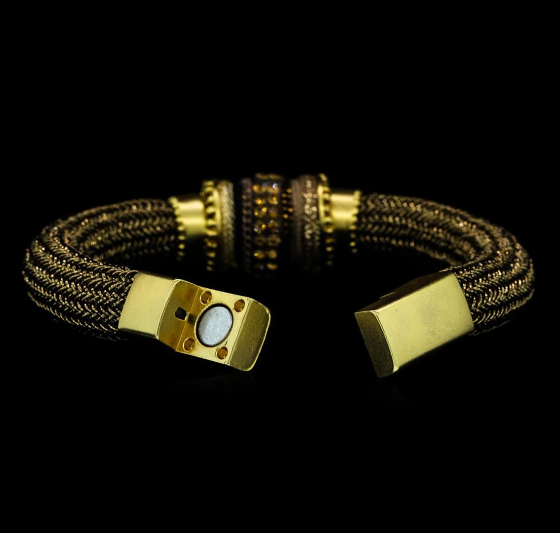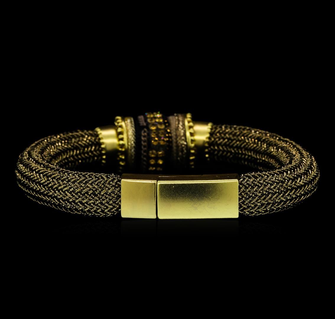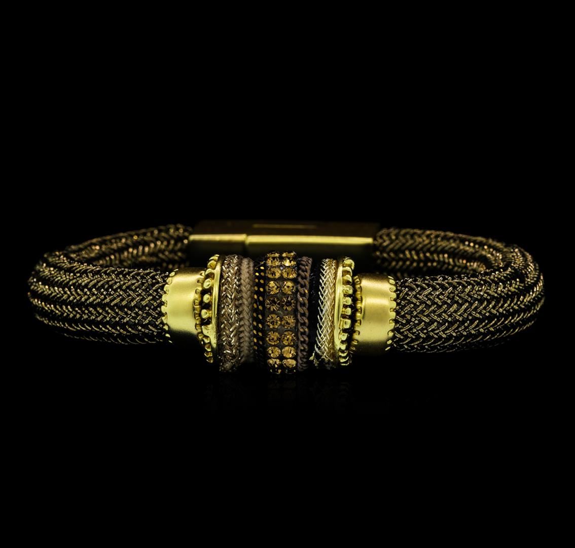 High end designer jewelry. Matte Gold Design Lurex Bracelet - Gold Plated. Gold Plated Metal/ Mag Clasp. Brown/ Gold. 7.5inches.