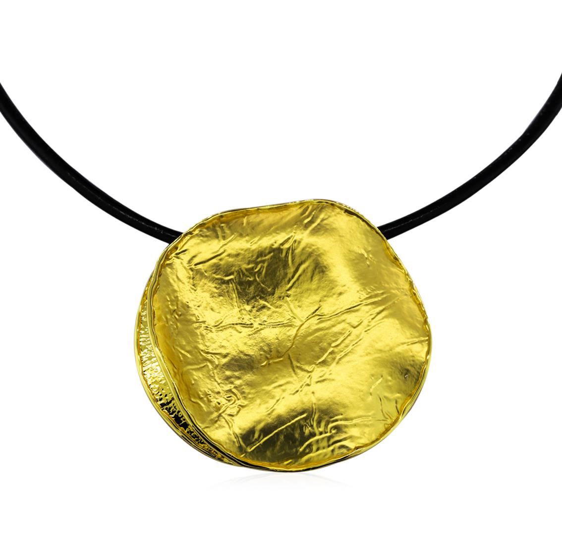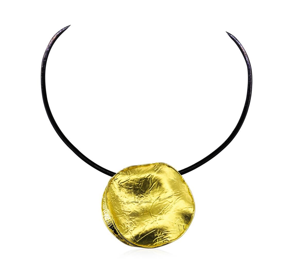 High end designer jewelry. Matte Hand Painted Medallion Necklace - Gold Plated. Gold Plated/3" Ext Clasp/ Leather Cord. Gold/ Brown. 16inches. Total Weight: 21.9 grams.