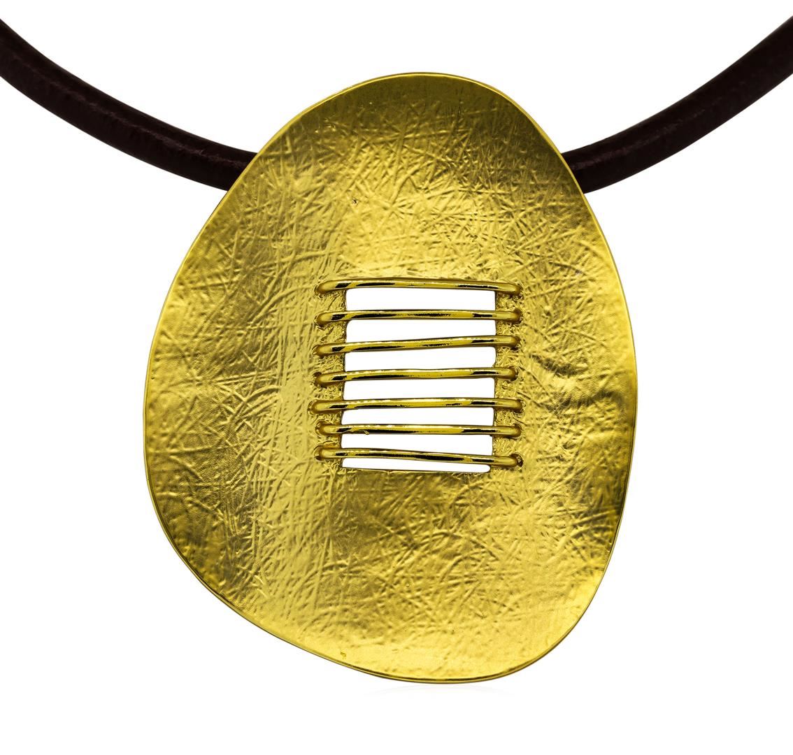 High end designer jewelry. Matte Oval Pendant Leather Necklace - Gold Plated. Gold Plated/3" Ext Clasp. Gold/ Brown. 16inches. Total Weight: 21.4 grams.