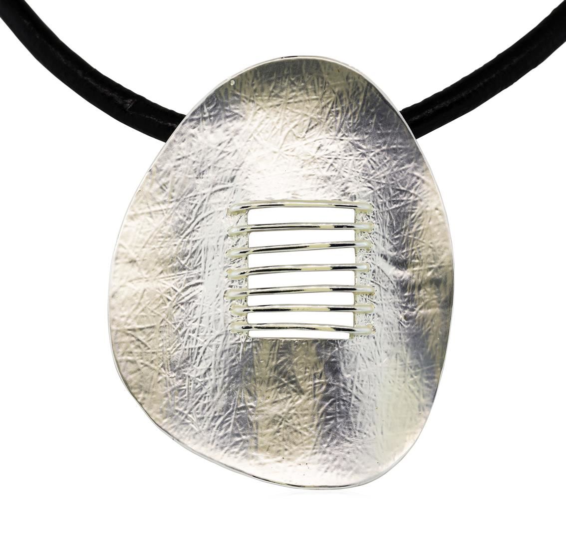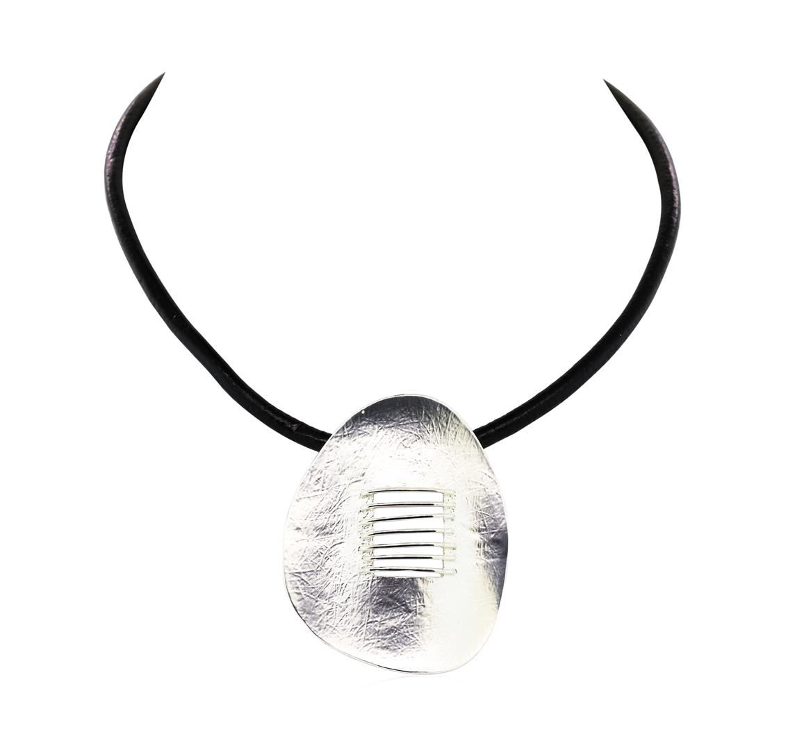 High end designer jewelry. Matte Oval Pendant Leather Necklace - Rhodium Plated. Rhodium Plated/3" Ext Clasp. Silver/ Black. 16inches. Total Weight: 21 grams.