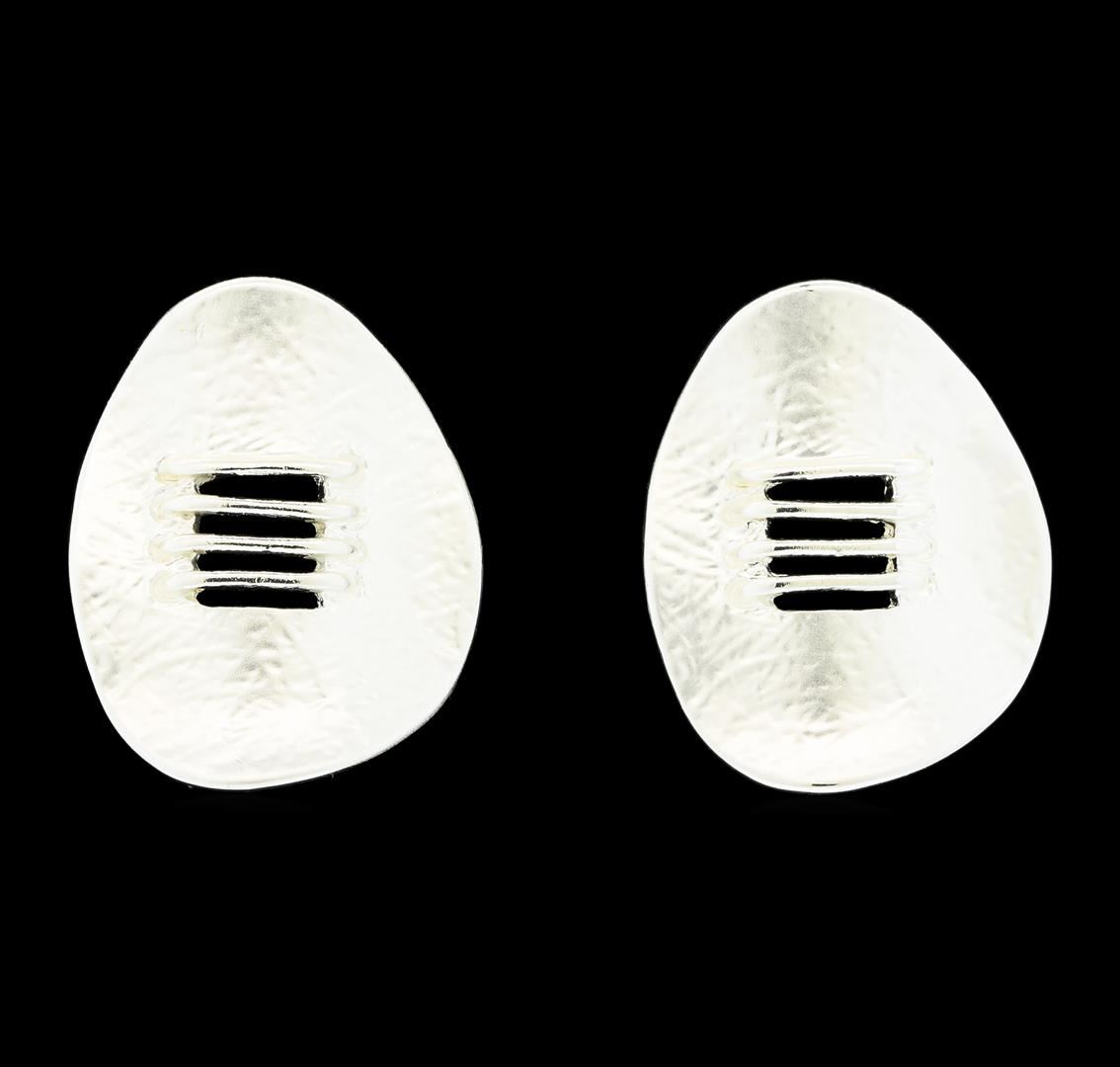 High end designer jewelry. Matte Oval Shape Post Earrings - Rhodium Plated. Rhodium Plated Stud Set. Silver. 1inch. Total Weight: 5.1 grams.