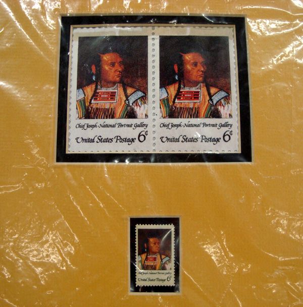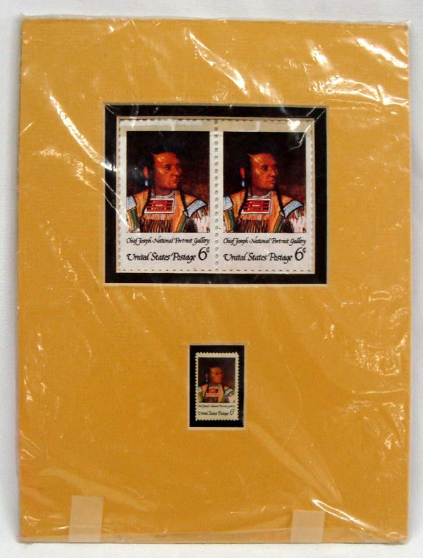Matted 1968 Original and Prints Chief Joseph U S 6 Cent Stamp. Issued to honor the American Indian, this stamp pictures Chief Joseph of the Nez Perce tribe. Chief Joseph was famous for his war strategy, as well as his courage, honor, and the consideration he showed his enemies. The stamp is unused, under plastic and ther are two prints in this matted presentation. The stamp is 1'' x 2.5''. The mat measures 9'' x 12''.