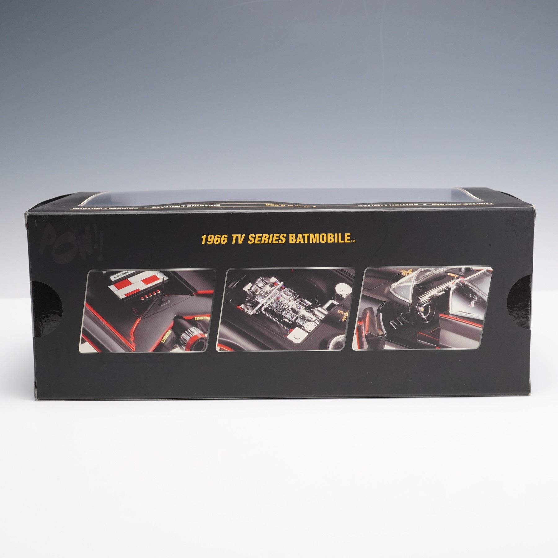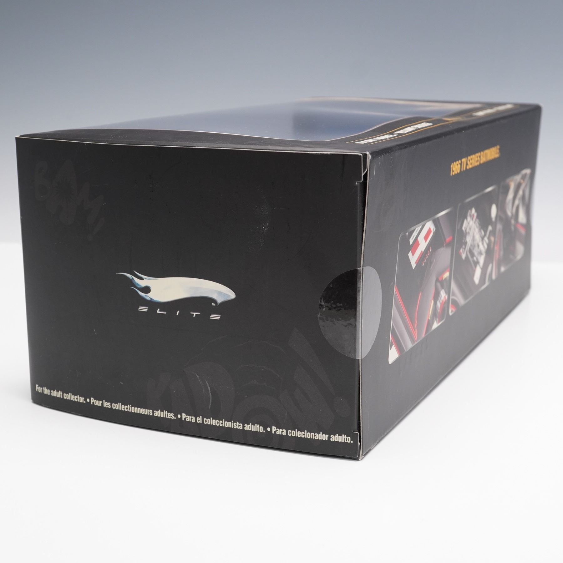 This limited edition die-cast model by Mattel Elite captures the legendary Batmobile from the 1966 Batman television series in 1:18 scale. The car is crafted with meticulous attention to detail, showcasing the sleek black body with red accents, bubble windshields, Bat-emblem hubcaps, and authentic interior controls. Produced as part of the DC Comics 75th Anniversary line, it comes in its original display box with themed graphics, making it an excellent addition for collectors and fans of classic television memorabilia.