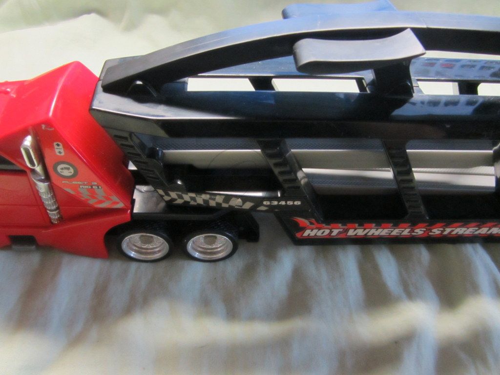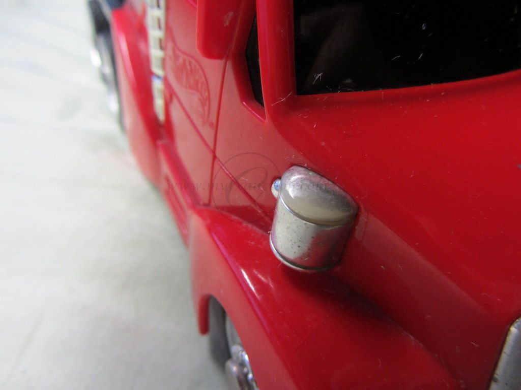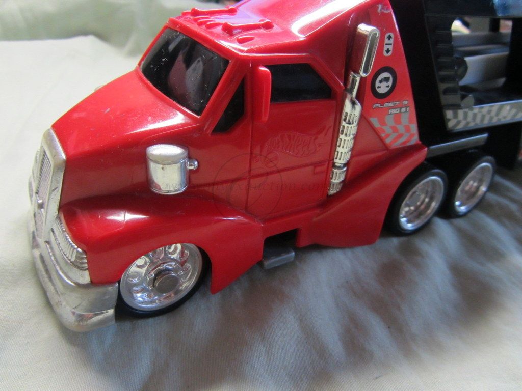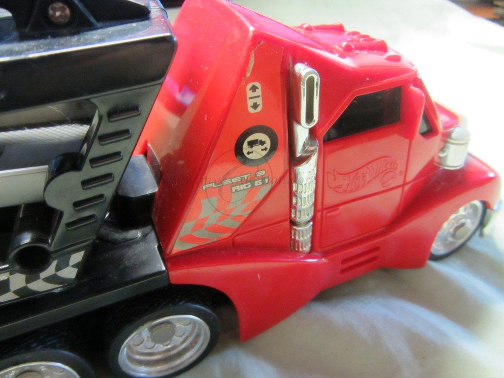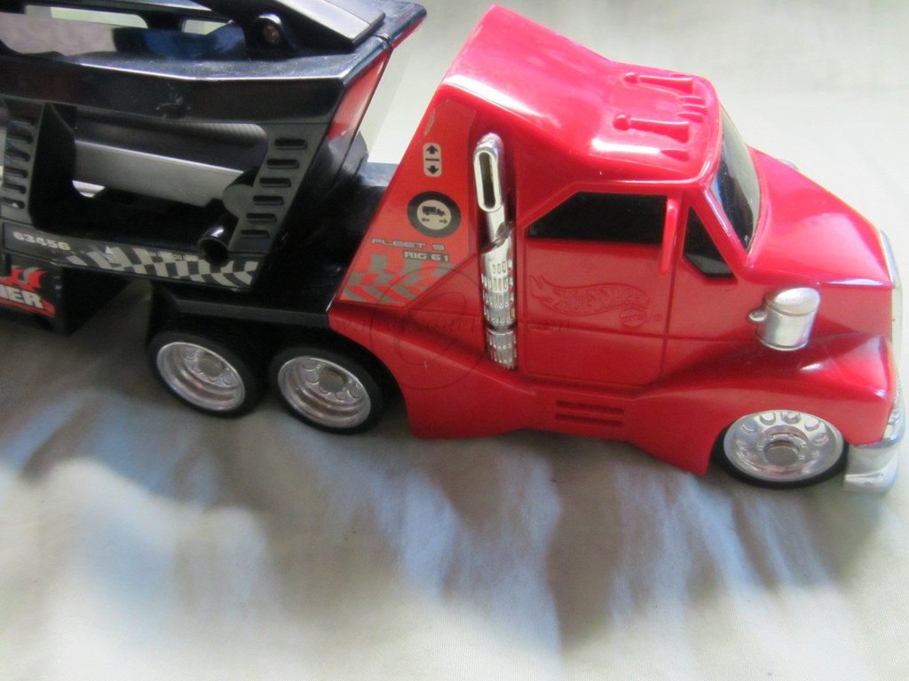 2000 Mattel Tractor Trailer Hotwheels Carrier. Mattel of course made this with hotwheels in mind, holds any standard die cast car. Holds 8-10 cars depending upon size. Used in very exceptable condition. NOTE: There is slight scuffing on the hood, generally overall from hours of play and the chrome is worn in places (see images for futher details).