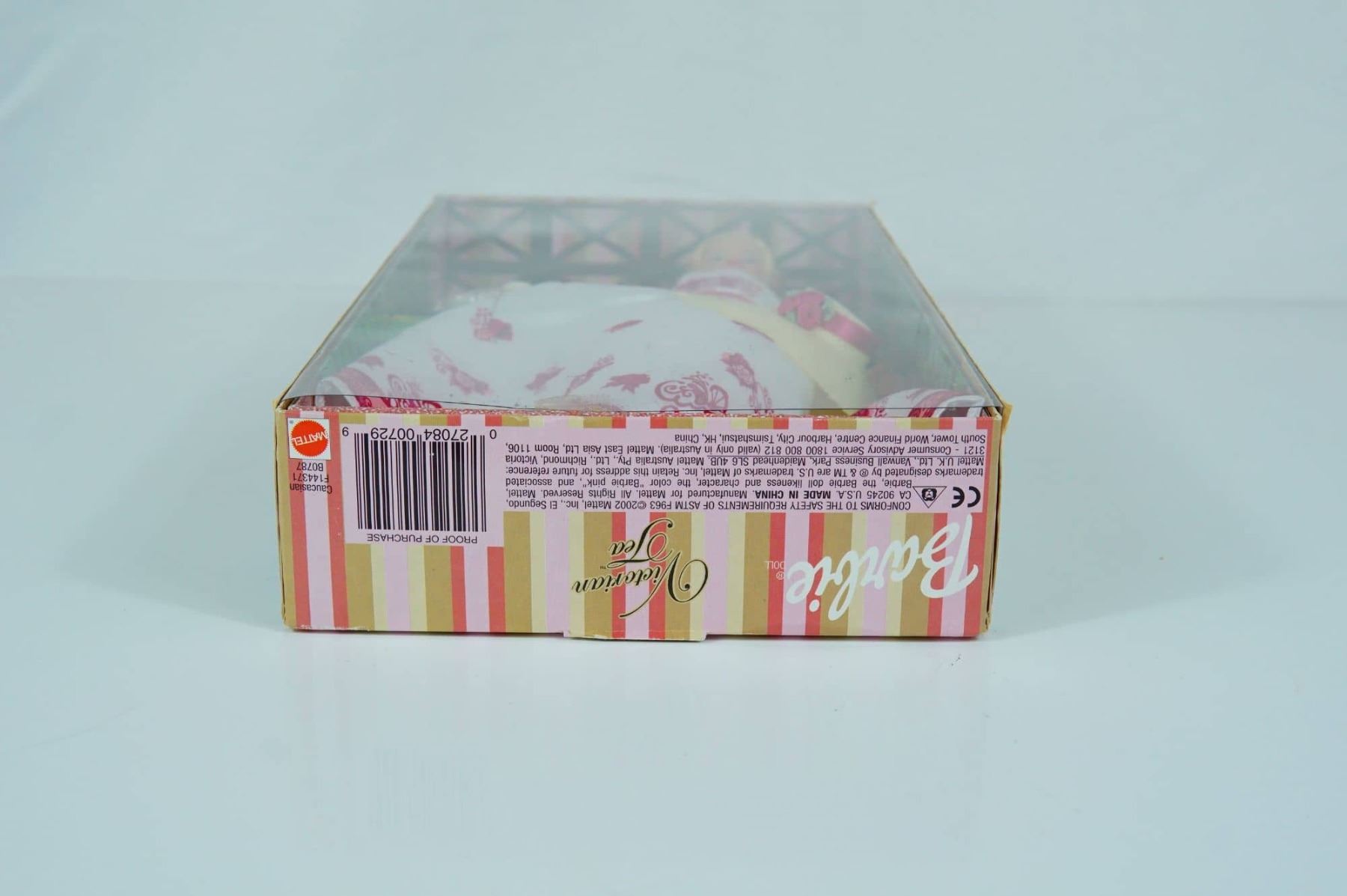Mattel vinyl Victorian Tea Barbie doll, model B0787. This Caucasian doll features rooted blonde hair styled in a formal Victorian-era updo and stationary painted blue eyes with detailed eyelashes. She wears her original Victorian-style white gown featuring pink floral transfer patterns and lace-like border detailing at the hem and sleeves. Accessories include a matching wide-brimmed straw-effect hat with a pink ribbon and rose accent, and a miniature tea service set on a floral-decorated tray. The bottom of the box is marked ©2002 Mattel, Inc. All Rights Reserved. 11.5 inches.