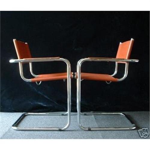 An incredible pair of Mid Century (late 50s / early 60s) Matteo Grassi Brown Chairs. Beautiful geometric architecture, VERY well-made and super sturdy. The fabric is genuine leather with a matte finish in a rust-ish/sienna color that harkens back to the Machine Age/Bauhaus Era. The leather seats and back rests are in gorgeous conditon with no tears, holes, etc.These will really be the focal point of any MODERN living space.