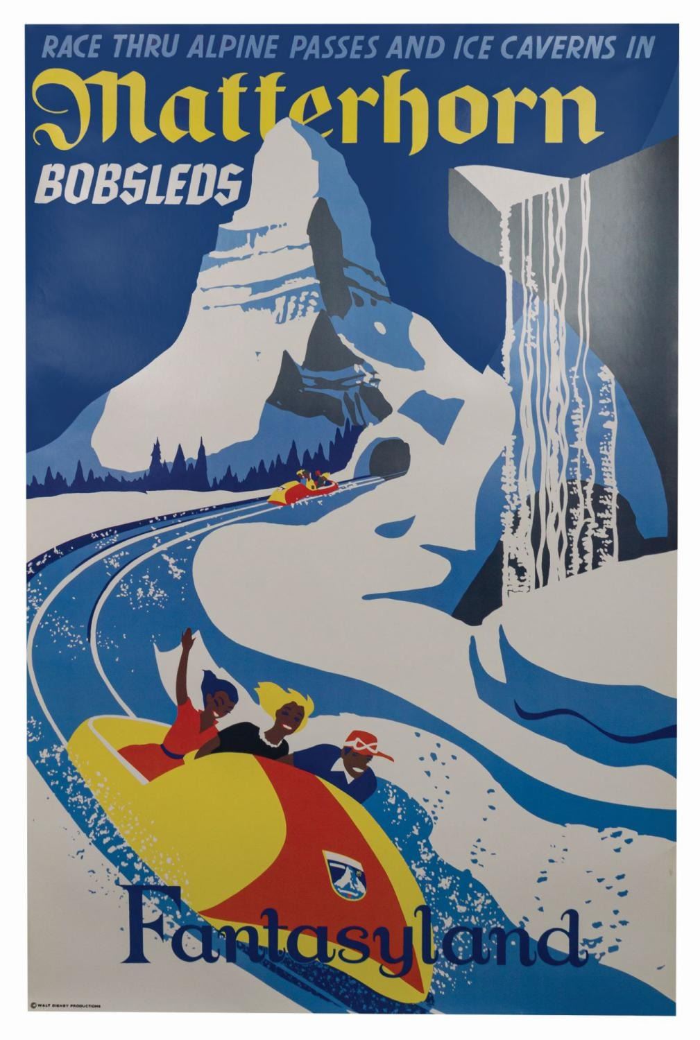(Disneyland, 1990s) A full-size attraction poster reproduction from the Disney Gallery featuring the Matterhorn Bobsleds. For a very short time, the Disney Gallery offered a limited amount of full-size reproduction attraction posters for many of the well-known Disneyland attractions. This faithful replica measures 54"x36" and is in very good condition with some edge-wear, including several small tears and areas of bending. There is a 1" tear at the lower right.