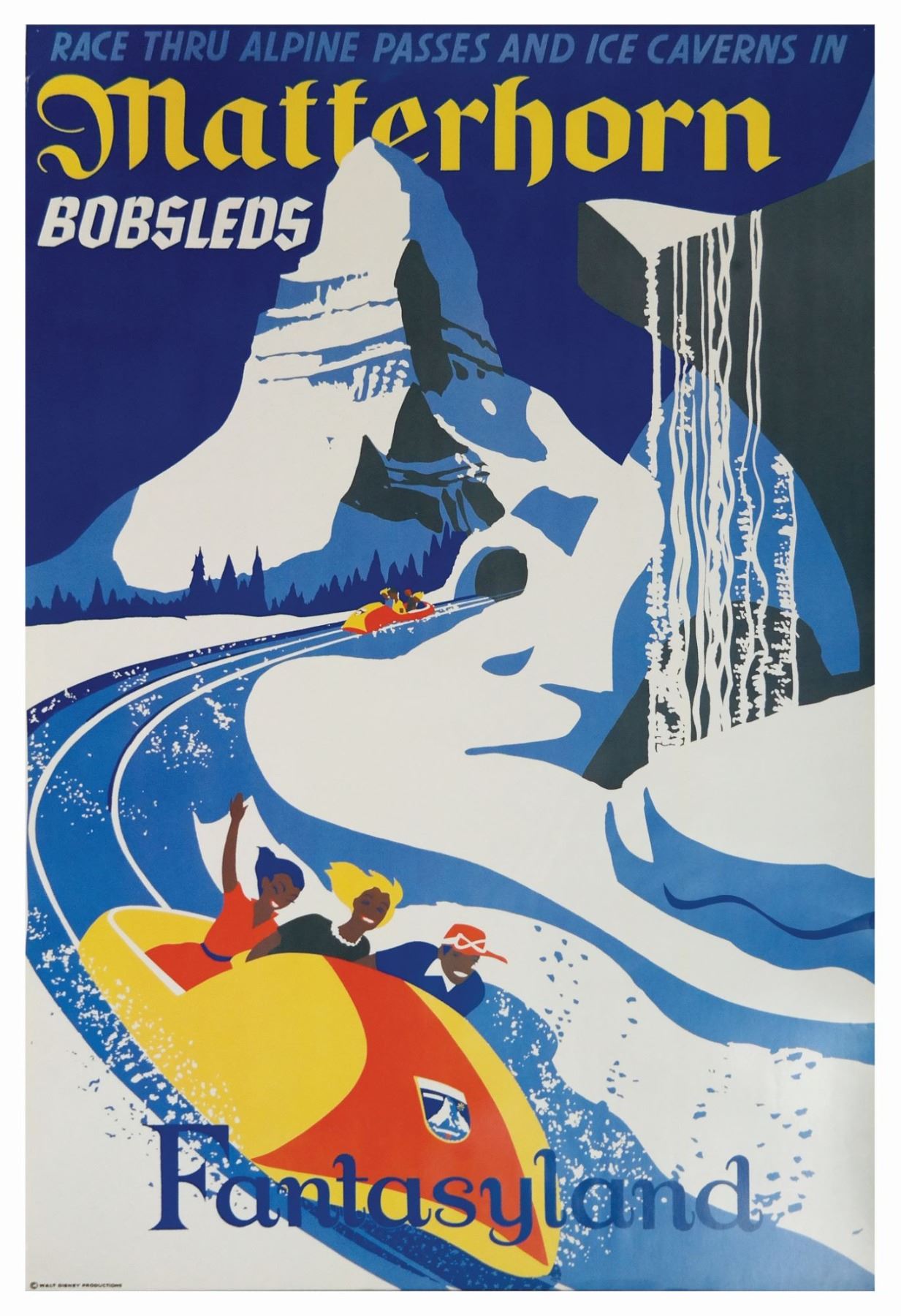 (Disneyland, c.2000s) A full-size Matterhorn Bobsleds attraction poster that was created for park-use but was never actually displayed. The earliest of these posters were hand-silkscreened, however more modern versions were printed on sturdier paper with ink that would perform better in sunlight. Measuring 54"x36", the poster is in very good condition with some edge-wear, including a few creases and pin holes in the corners.