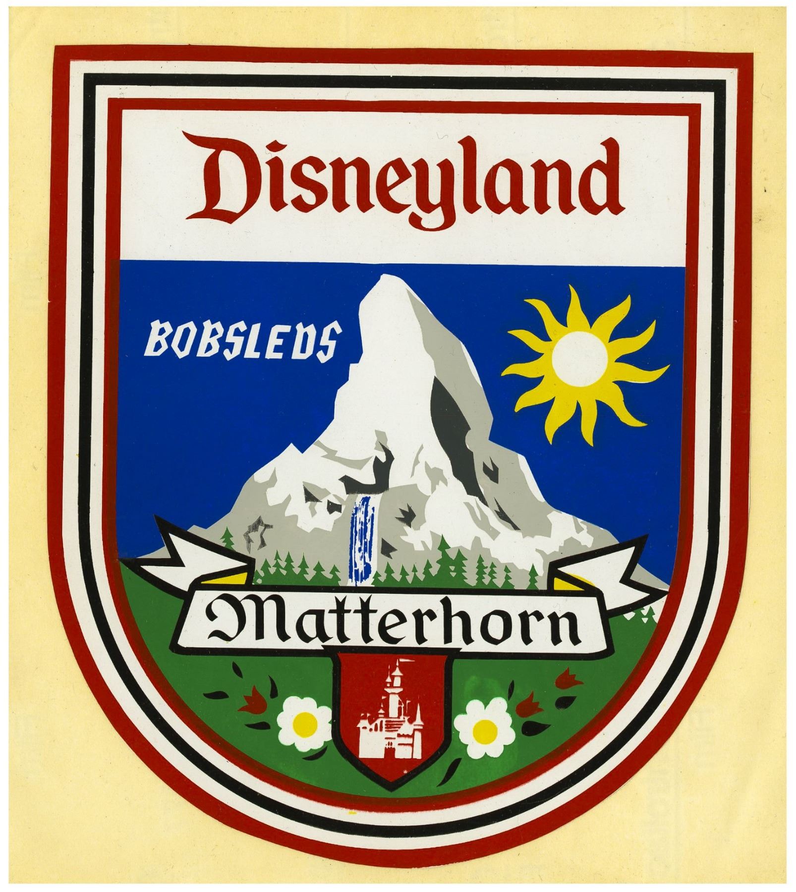 (Disneyland, c.1980s) An unused large sticker created for Disneyland's "Matterhorn Bobsleds" ride vehicles. This vehicle sticker depicts the Matterhorn within the familiar attraction crest. The sticker itself measures 8.25"x7" and is in very good condition.