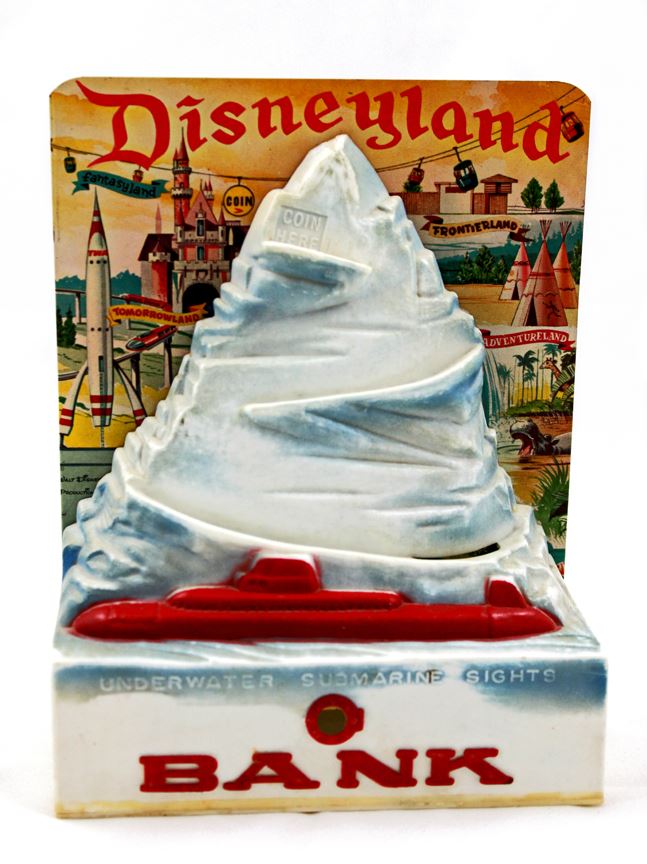 (Disneyland, 1959) Rare tin-litho and molded plastic bank produced in the opening year of the new, Matterhorn Bobsleds. Reminiscent of the park’s many cartoon rendered attraction maps, the background features prominent landmarks from the various themed lands. As in the geography of the park, the Submarine Voyage sits at the foot of the Swiss mountain. Celebrating that new attraction, one can peer through an opening on the toy’s base and see underwater renderings of the Submarine Voyage. Considered by many as one of the top Disneyland toys of all-time. Measuring 10 x 7 x 2 in. In very good condition.