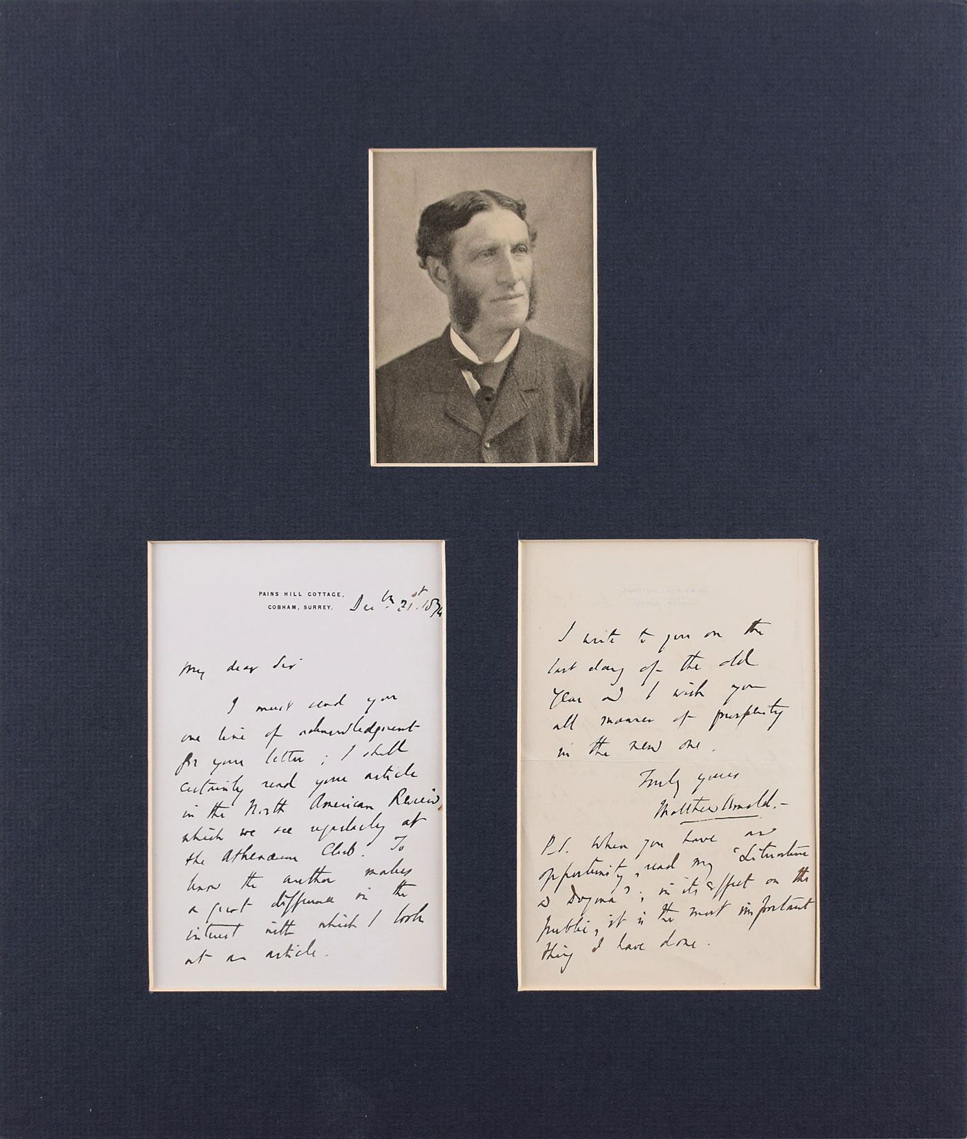 ALS, one page both sides, 3.75 x 5.75, Pains Hill Cottage letterhead, December 31, 1874. Letter to a gentleman, in part: "I shall certainly read your article in the North American Review which we see regularly at the Athenaeum Club. To know the author makes a great difference in the interest with which I look at an article. I write to you on the last day of the old year and I wish you all manner of prosperity in the new one…P.S. When you have an opportunity read my 'Literature and Dogma'; in its effect on the public, it is the most important thing I have done." Matted beside a photocopy of the front, as well as a portrait, to an overall size of 12.5 x 14.75. In fine condition.