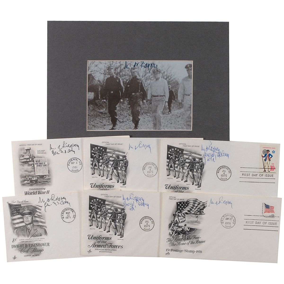 A glossy 5.5 x 3.5 photo of Ridgway walking with three other soldiers, signed in black felt tip, “M. B. Ridgway,” and matted to an overall size of 10 x 8; and six FDCs, each with a patriotic cachet, each signed in blue or black ink by Ridgway. In fine condition.